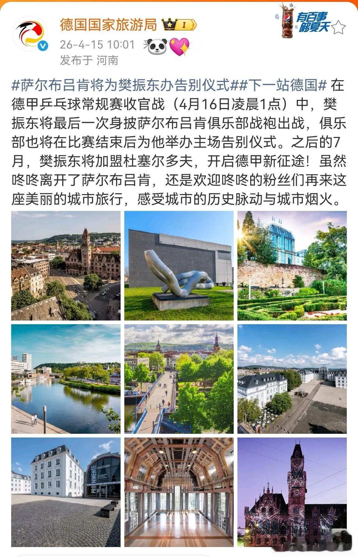 樊振东在萨尔布吕肯的合约到期,还有最后一场球,德国国家旅游局为此文,萨尔布吕肯为樊振东举办主场告别仪式。看来仪式感也是拉满了。