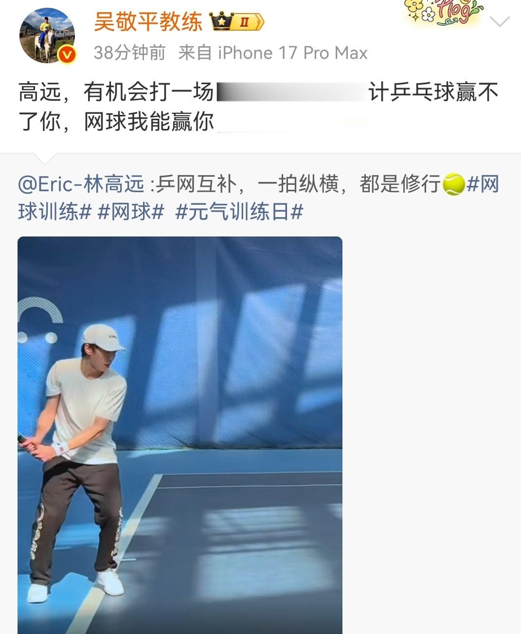 大概是吴敬平教练是看了高远的视频,他也很快发了微博,喊话:高远,有机会打一场网球比赛,我估计乒乓球赢不了你,网球我能赢你,加油练哦。