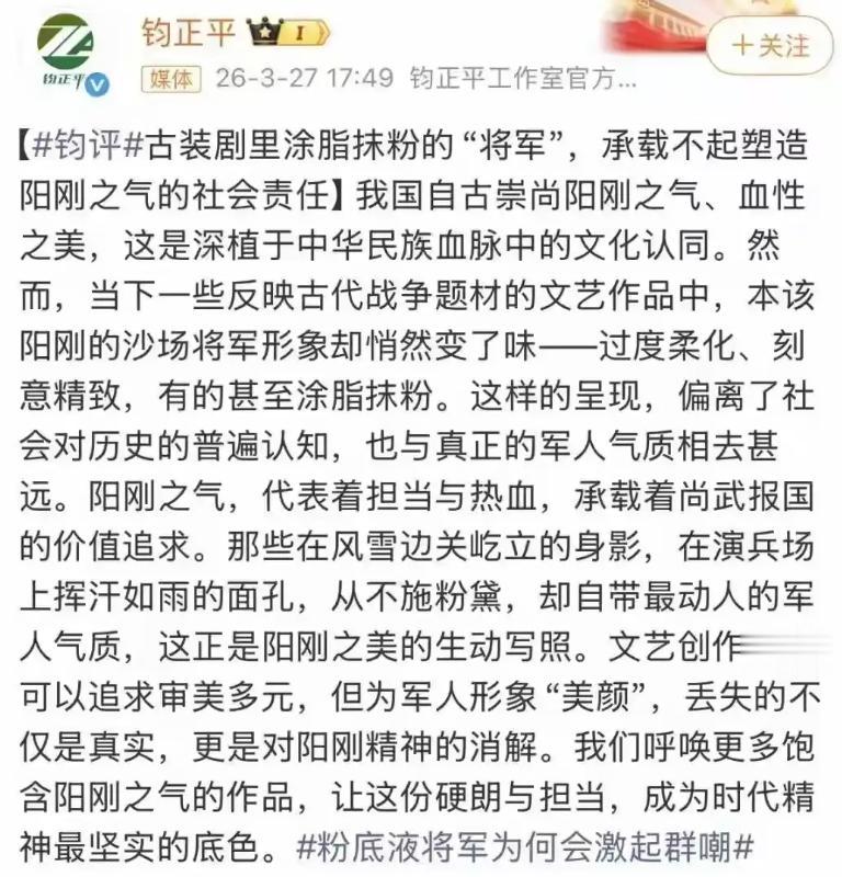 解放军报直接点名所谓的“粉底液将军”,痛批这类小白脸的形象与军人气质相去甚远,更是对历史的亵渎。