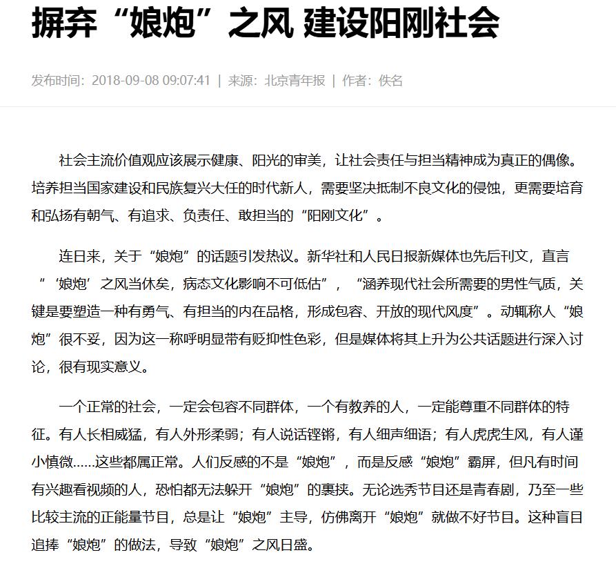 《摒弃“娘炮”之风 建设阳刚社会》北京青年报