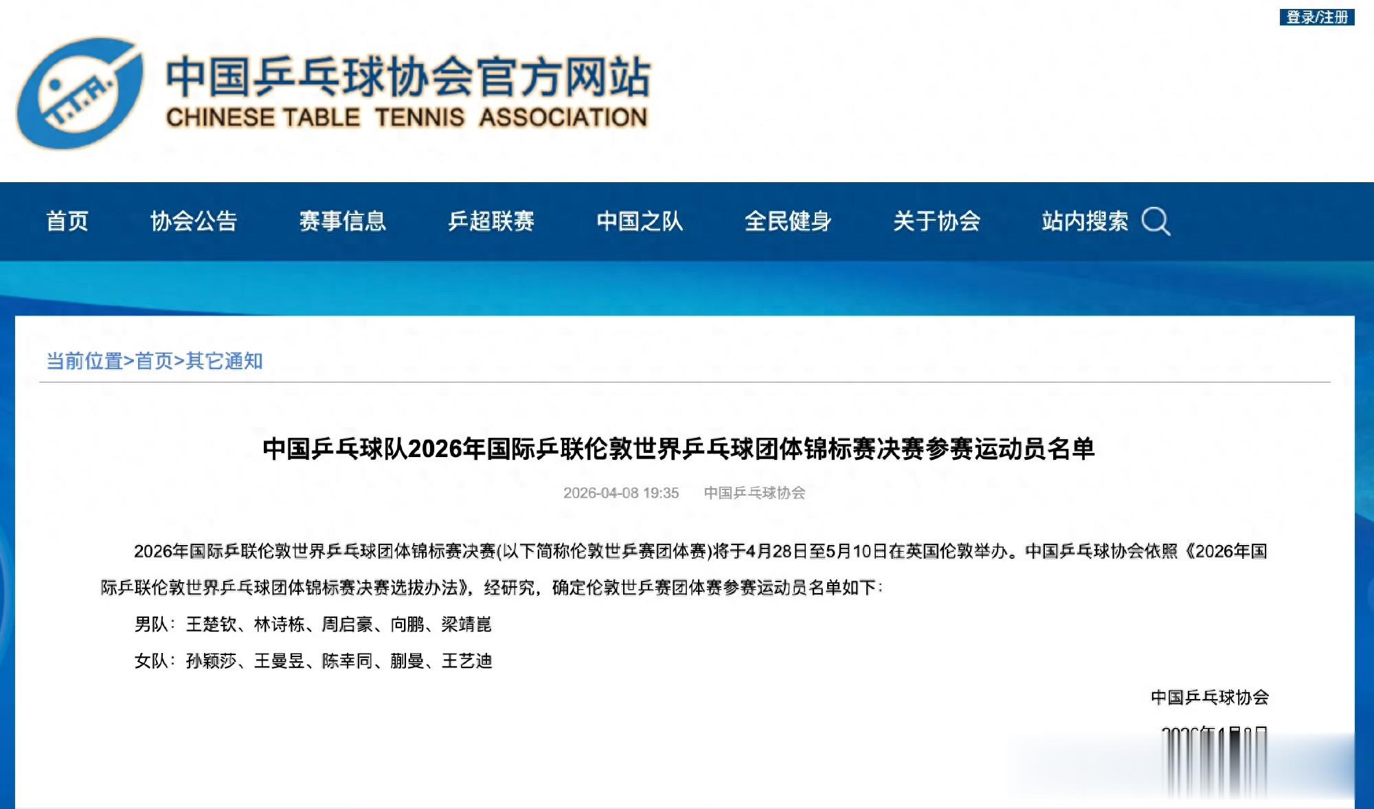 北京时间4月8日,距离伦敦世乒赛团体赛参赛人员名单上报还差最后几个小时时间,中国乒协公布了此次参赛人员名单。这符合中国乒协一贯的作风,不到最后一刻绝不公布。