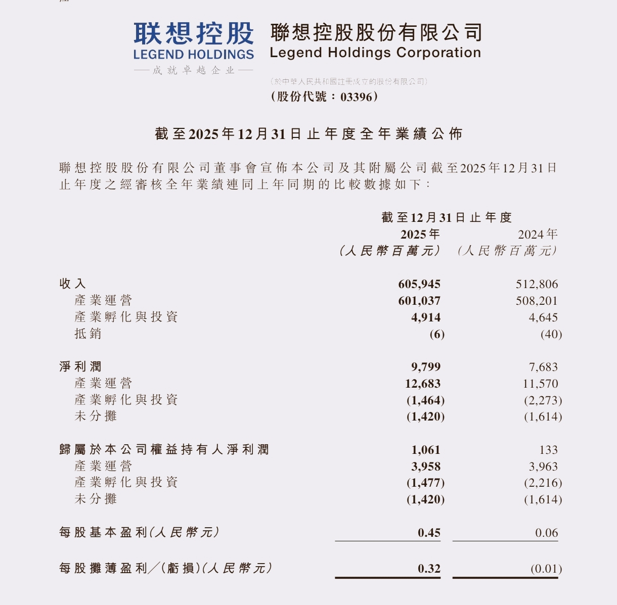 一,联想控股业绩回顾2025年度,联想控股的经营业绩如下: