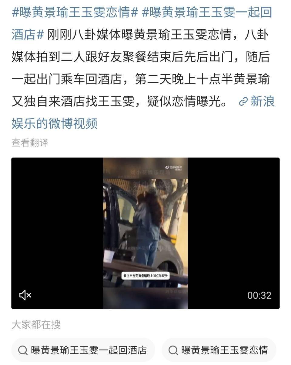 4月10日,娱乐圈传出新瓜,有八卦媒体爆料称拍到了演员黄景瑜和女明星王玉雯聚餐同回酒店的模糊视频,然后说两人疑似恋情。结