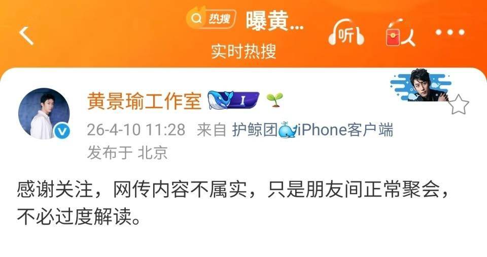 结果黄景瑜工作室直接光速下场,11 点 28 分就发声明:“网传内容不属实,只是朋友间正常聚会,不必过度解读”。