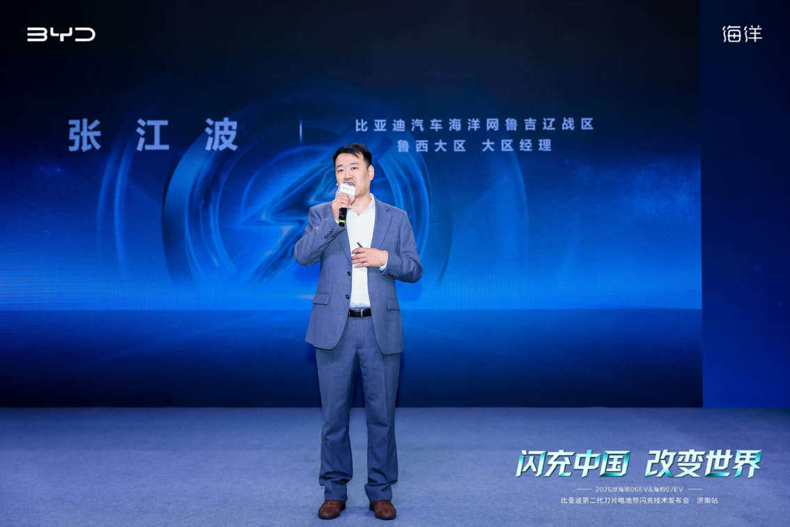 活动现场,比亚迪海洋网鲁吉辽战区张江波先生登台致辞,他表示,2026年3月比亚迪正式发布了具有行业里程碑意义的第二代刀片电池与全域闪充技术,再度颠覆了新能源汽车补能效率的行业标准。海洋网始终秉持“技术为王,创新为本”的核心理念,以技术突破为锚点,引领纯电出行全面迈入“全场景闪充无忧”的全新纪元,让每一位用户都能以更高效、更便捷的方式,解锁新能源出行的无限可能。