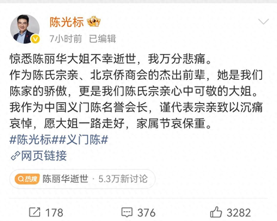 悼念陈丽华时,他深情地称呼“陈家大姐”,还以“陈氏宗亲”的名义发文。
