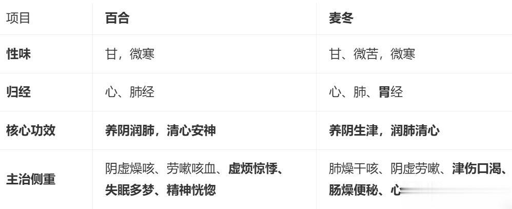 百合:重在清心安神,尤擅治疗心阴不足所致的失眠、惊悸、精神恍惚,润肺为辅,为“养心润肺之要药”。