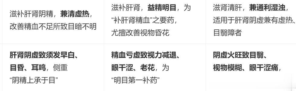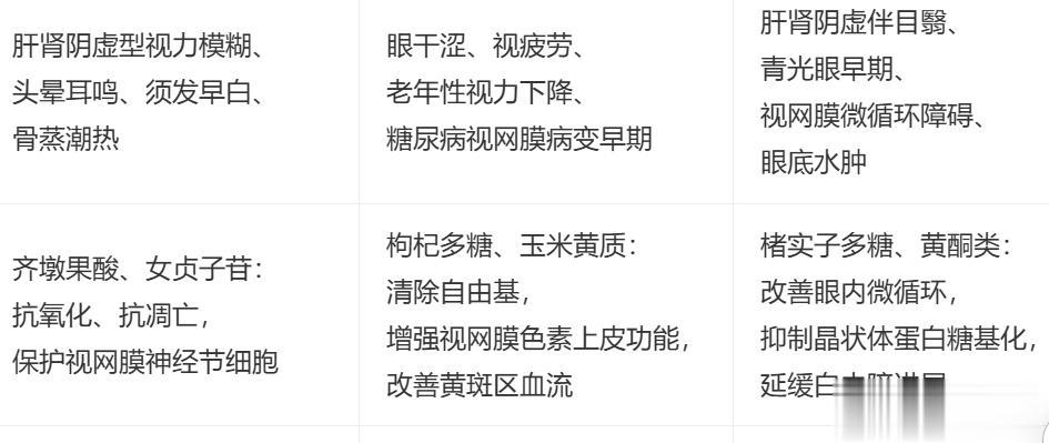 杞菊地黄丸(枸杞子 + 菊花 + 六味地黄):专治肝肾阴虚目昏、视物模糊。