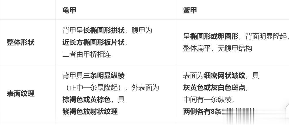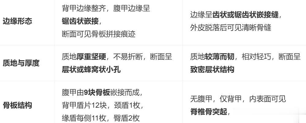 龟甲三棱板片硬,腹甲九骨放射纹;龟甲(背甲与腹甲)的三条纵棱、腹甲骨板结构、放射状纹理