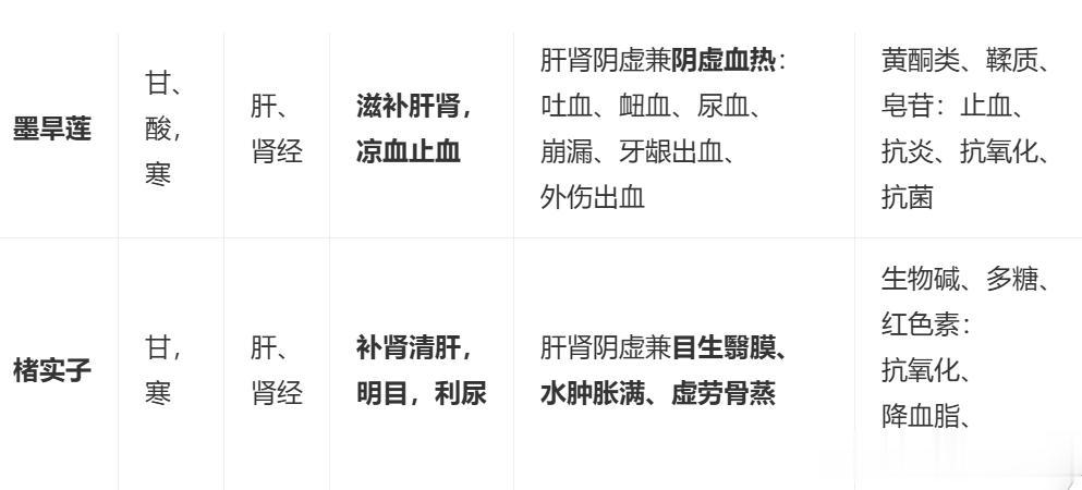 墨旱莲:唯一具止血功能;性寒(凉血止血),脾胃虚寒、孕妇慎用;忌与藜芦同用。