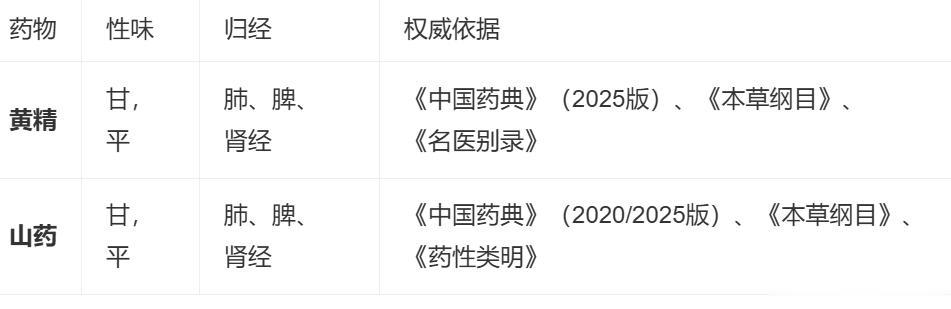 在补阴药中的归经属性具有高度一致性,二者均明确归入肺、脾、肾三经,无权威文献记载存在分歧。 归经确定性对比
