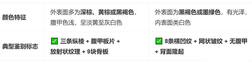 直观辨识口诀 龟甲三棱板片硬,腹甲九骨放射纹; 鳖甲八凹网纹深,无腹隆背薄而韧。