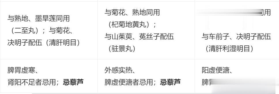 女贞子:用于乌发,须发早白,是其特色,常与墨旱莲配伍为“二至丸”;脾胃虚寒、便溏者忌用。
