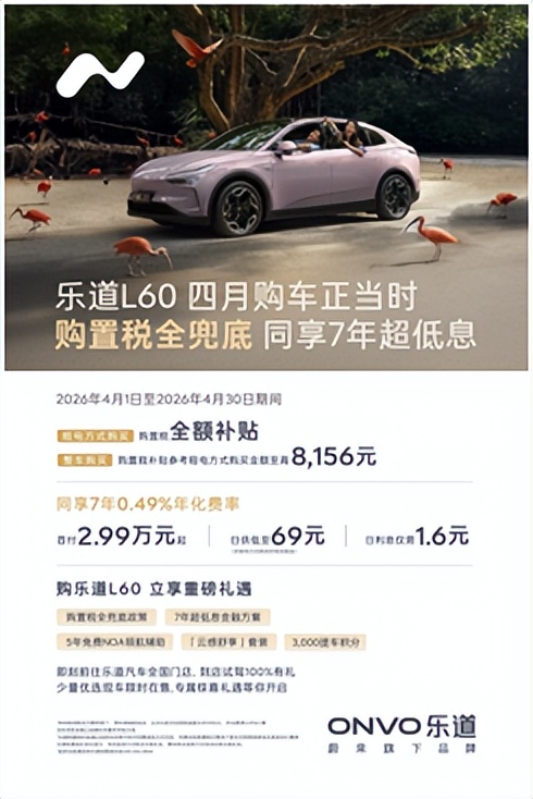 4月购车黄金期,乐道推出多重政策组合拳:国家针对换电车型减免购置税的基础上,额外提供“购置税全兜底”福利,电池租用方案可享全额补贴,整车购买至高补贴8156元;金融方案首付仅需29,980元,日供低至69元,7年超长周期大幅缓解资金压力。购车用户还可解锁5年免费NOA领航辅助、云感舒享套装及3000提车积分。