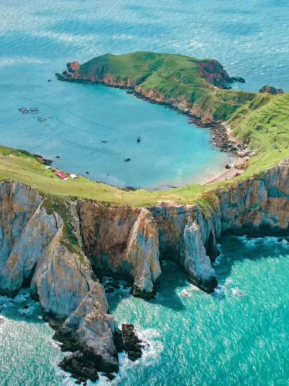 东礵岛最震撼,断崖直插湛蓝深海,崖顶却铺着一望无际的翠绿草甸。站在崖边往下看,海浪拍打着礁石,溅起白色的浪花,那种壮阔,让人忘了自己是谁。