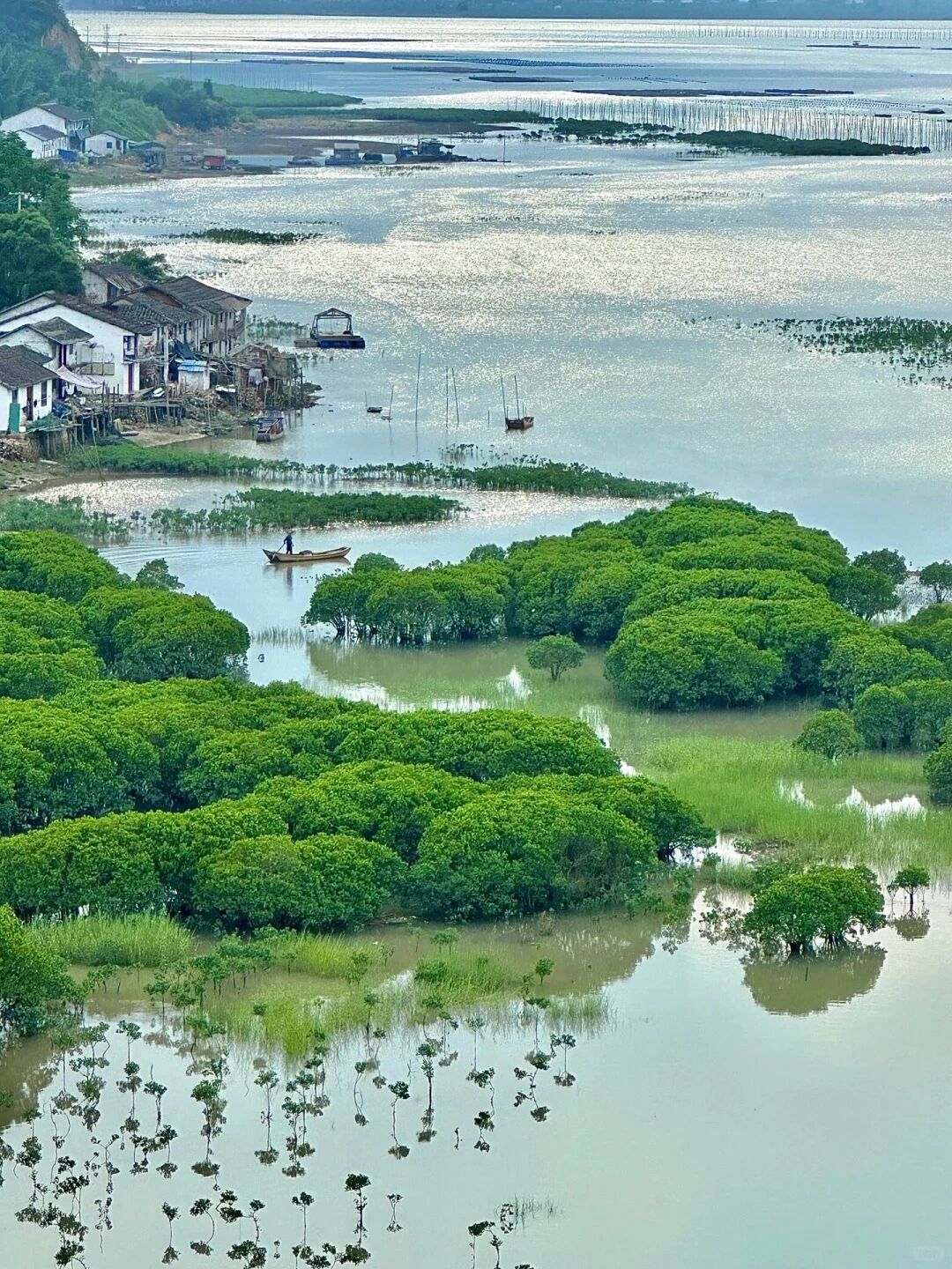 涨潮时,红树林随波摇曳,把海湾切割成蜿蜒的水道。坐着小船穿行其间,两边是绿色的树,脚下是碧蓝的水,头顶是蓝天白云,像走进了水墨画里。船夫摇着桨,慢慢走,偶尔停下来指给你看,哪棵树长了多少年,哪片水域有什么鱼。