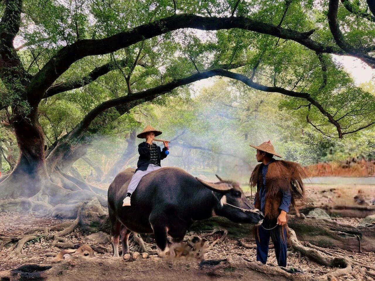 树龄最长的有800多年,枝繁叶茂,气根垂下来像老爷爷的胡须。阳光透过树叶洒下来,形成一道道丁达尔光,像舞台上的追光灯。清晨,村里人牵着牛从树下走过,或者赶着鹅群穿过林间,那画面,像走进了古画里。