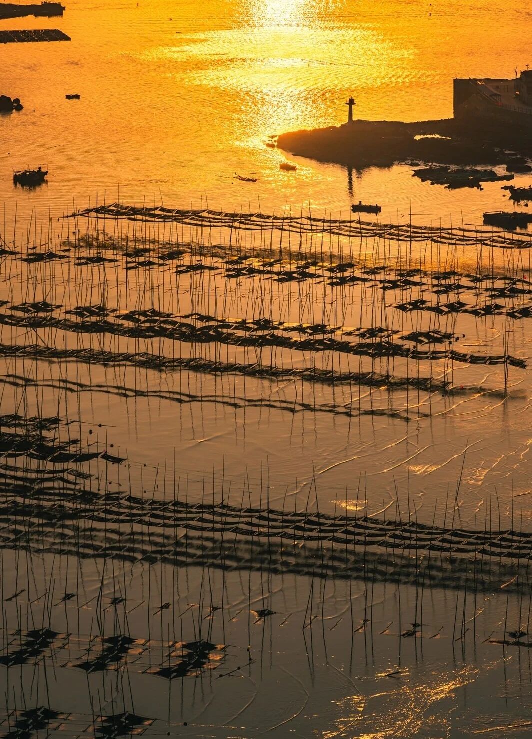 站在岸边看,海带在阳光下闪着光,渔船在海带间穿行,白鹭在头顶飞过。自然与人文交织在一起,美得像诗。