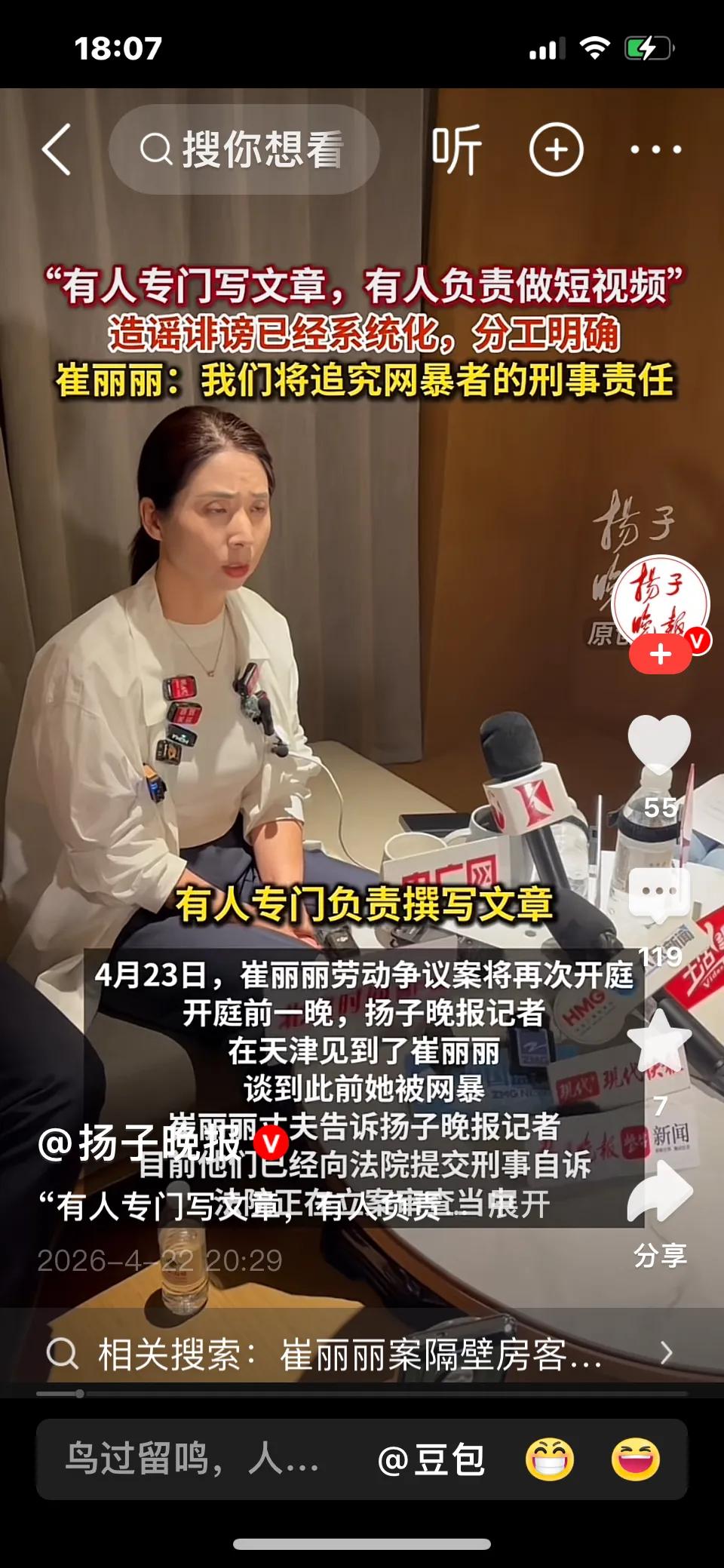 4月23日,崔丽丽劳动争议案将再次开庭。开庭前一晚,扬子晚报记者在天津见到了崔丽丽,她说,“有人专门写文章,有人专门二创成短视频、疯狂传播。还有在评论区高度统一的水军,我们怀疑(网暴者)系统化、分工明确的,让我感受到个人力量的渺小。”
