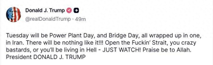 更荒唐的是,在复活节这个西方传统节日里,特朗普在社交平台上用粗俗不堪的言辞威胁伊朗,叫嚣要打开霍尔木兹海峡,否则就让伊朗下地狱,甚至设定最后期限,扬言要轰炸伊朗的电厂与大桥。而美国网络上却又传出特朗普去世了的谣言。