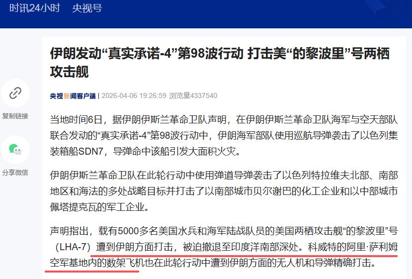 参考:央视新闻2026-04-06伊朗发动“真实承诺-4”第98波行动打击美“的黎波里”号两栖攻击舰