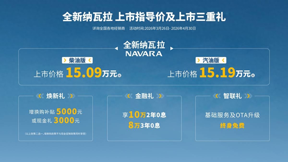 3月26日,在“雨林秘境穿越之旅暨 2026 年春季双品牌新车上市品鉴”活动中,全新纳瓦拉荣耀上市!15.09万起,以国际化全域舒享皮卡之姿,重塑高端皮卡标杆。更有焕新礼、金融礼、智联礼三重好礼限时发放,为追求品质与自由的皮卡玩家带来兼具国际品质、乘用舒适与全场景实力的出行新选择。