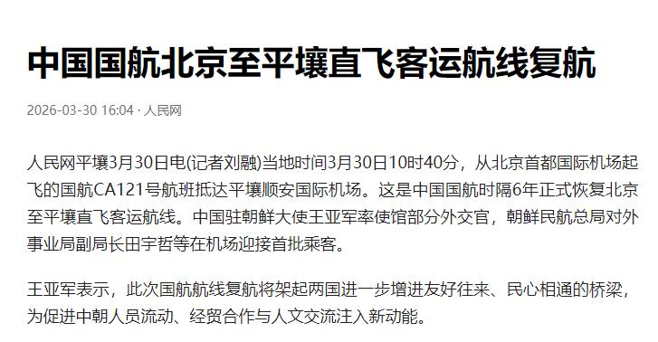 3月30日的时候,中国国航北京至平壤直飞客运航线复航。此次国航航线复航将架起两国进一步增进友好往来、民心相通的桥梁,为促进中朝人员流动、经贸合作与人文交流注入新动能。