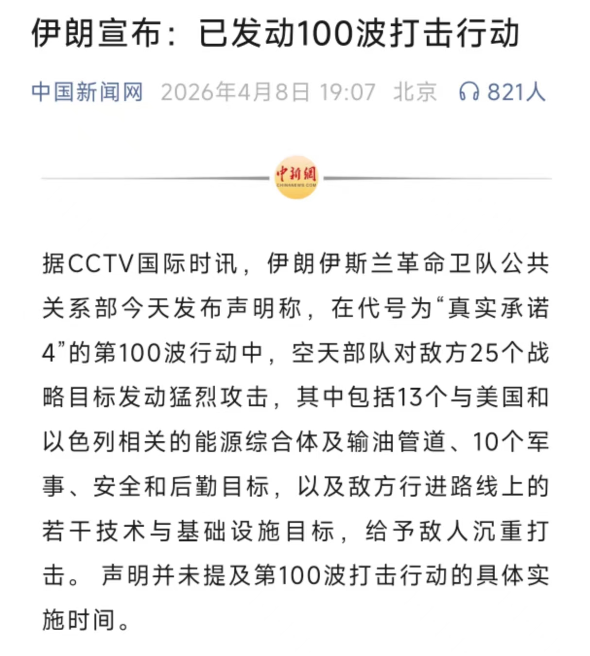 就在双方刚宣布停火不到24小时,伊朗伊斯兰革命卫队宣布已经准备好了伊朗“真实承诺-4”行动第100轮攻势,包括打击美国和以色列的军事目标以及输油管道等。至于何时开始,时间待定。