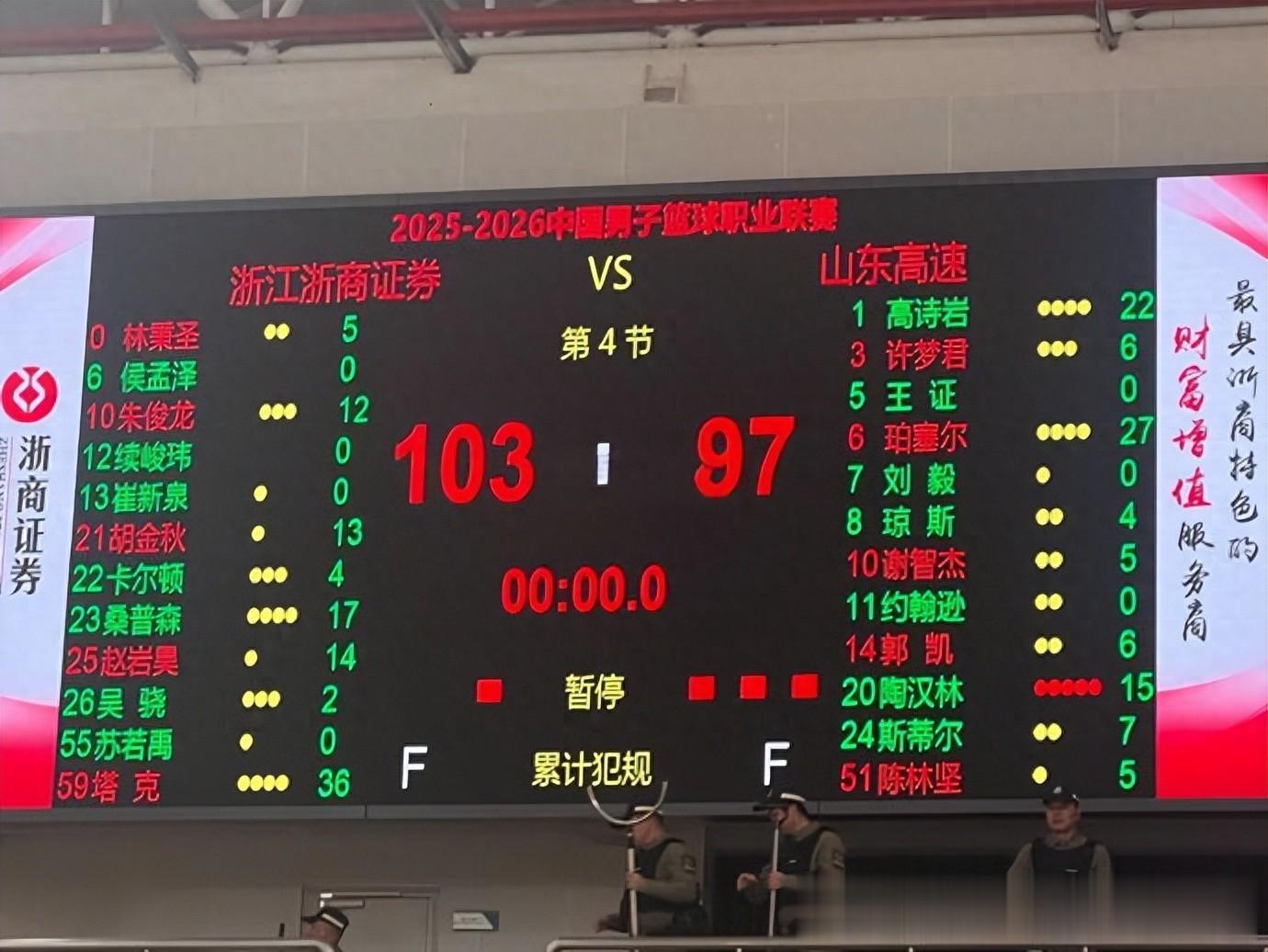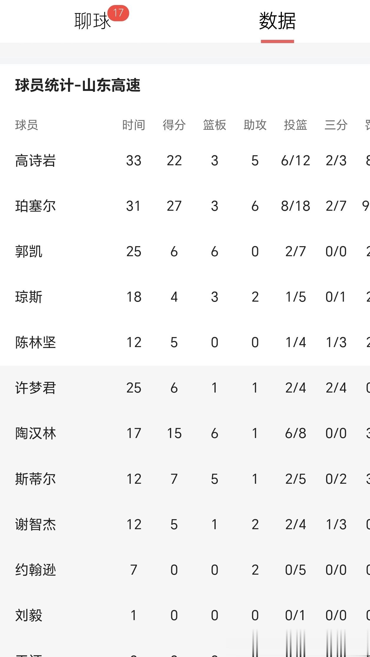全队三人上双,他扛着山东走了33分钟这场比赛,山东只有三人得分上双——珀塞尔27分、高诗岩22分、陶汉林15分。珀塞尔是外援,陶汉林末节五犯离场,只有高诗岩,从第一节打到最后一秒,攻防两端一刻都没停过。