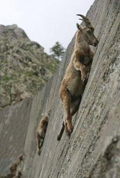 前面两张图是在岩壁上行走的羊,它们只为了吃一口盐巴。三图这是一只拥有长角的公羊,它已经无视重力。四图也是浪漫的一张,你愿意和你的爱人在这样的悬崖峭壁上谈理想,这两只羊幸福吗?