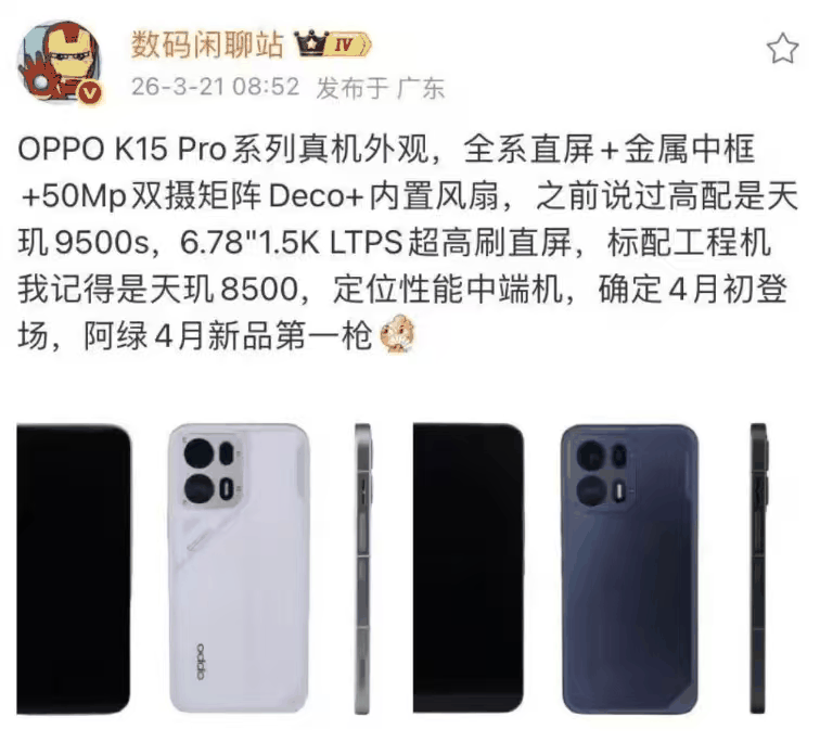 距离官方正式发布还有十多天,3月下旬就有网友在微博上提前曝光了OPPO K15 Pro的真机图片,在今年的中端手机市场里,这台新机的价值不只是更换了核心芯片,更体现出OPPO想要进一步提升K系列性能机定位的决心,直屏设计、金属中框以及主动风扇等配置全部搭载,高配版本甚至有望采用天玑9系处理器,相比外观而言更能勾起用户期待。
