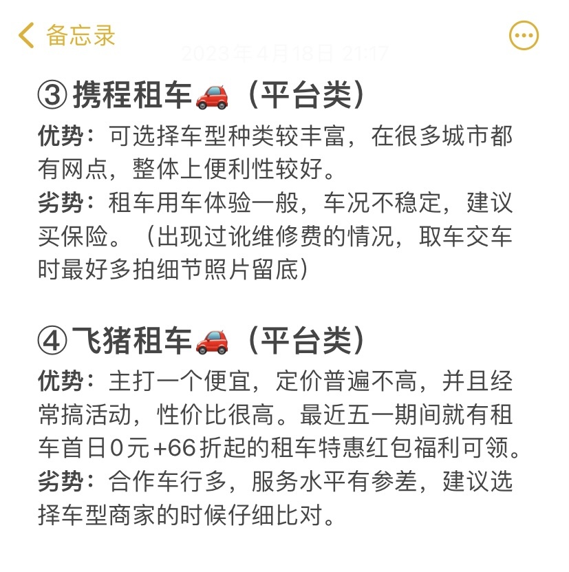 优势:租车老平台了,覆盖网点多,三线以上城市基本都有;可以自助提车,取车效率高还照顾到了社恐人士;并且客服很nice,处理问题很及时!