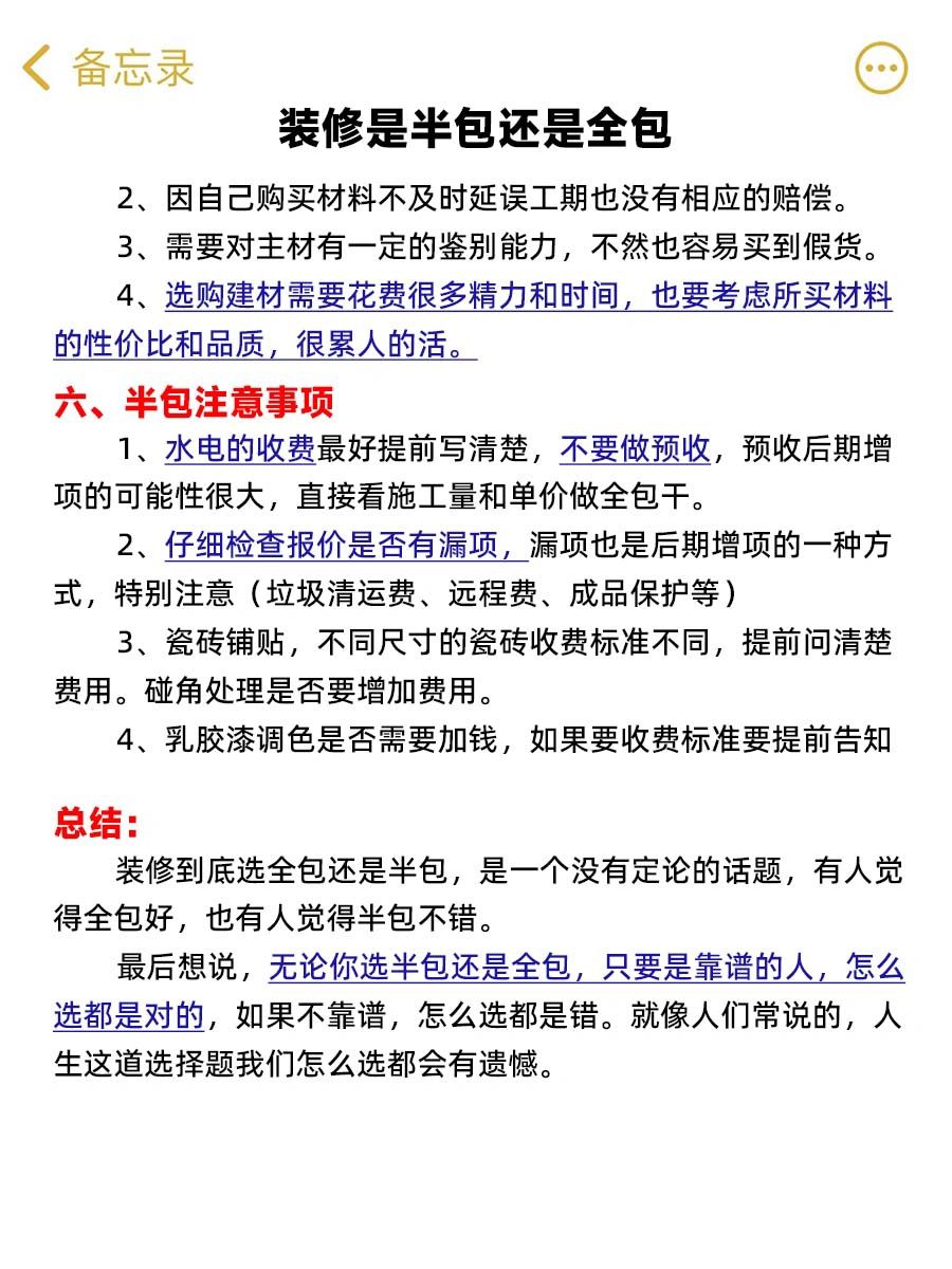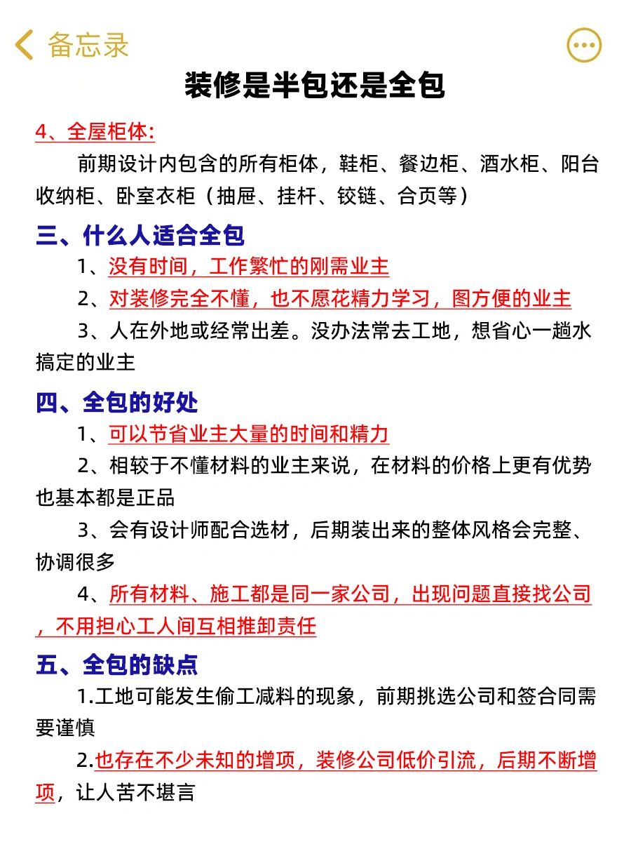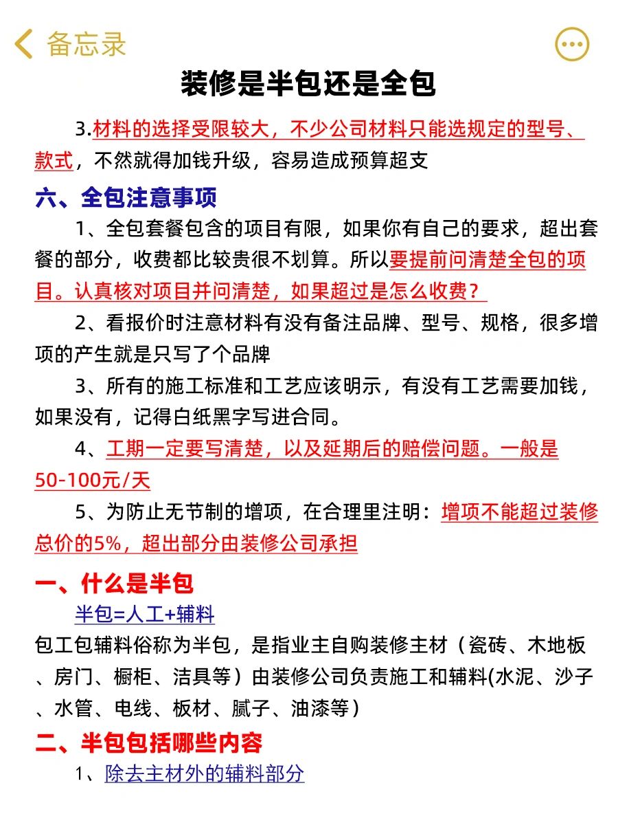 1、全包套餐包含的项目有限,如果你有自己的要求,超出套餐的部分,收费都比较贵很不划算。所以要提前问清楚全包的项目。认真核对项目并问清楚,如果超过是怎么收费? 2、看报价时注意材料有没有备注品牌、型号、规格,很多增项的产生就是只写了个品牌 3、所有的施工标准和工艺应该明示,有没有工艺需要加钱,如果没有,记得白纸黑字写进同。 4、工期一定要写清楚,以及延期后的赔偿问题。一般是 50-100元/天 5、为防止无节制的增项,在合理里注明:增项不能超过装修总价的5%,超出部分由装修公司承担