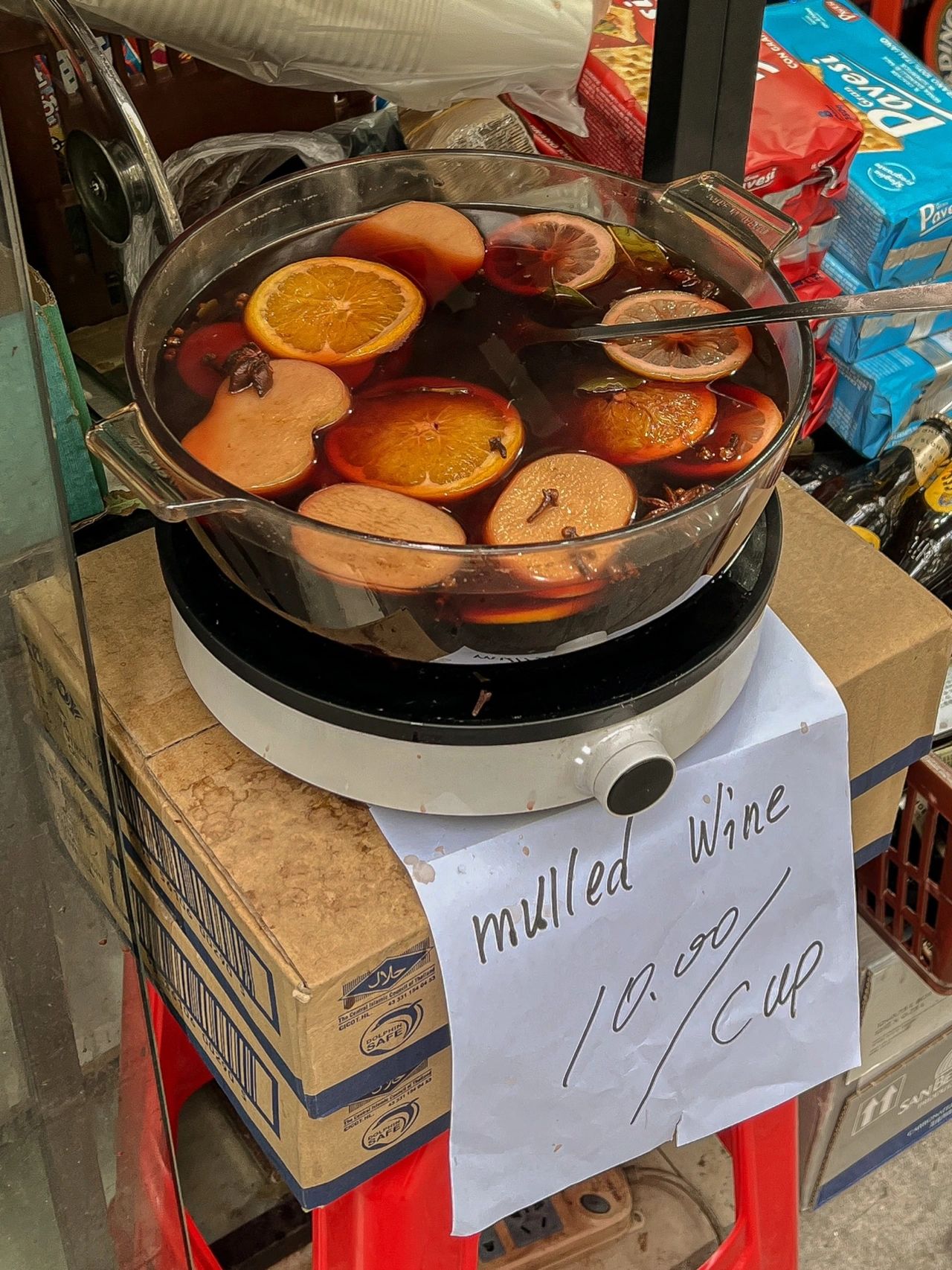 应该是上海最便宜的热红酒了吧! 10r一杯,一点也不比酒吧的差!! 酸甜度中和的太妙了,肉桂气息也很足 真的一口气喝完! 一家进口超市在门口支了一个小摊 摆了一大锅热红酒,下面还在煮 拿到手上都是热气腾腾的捏! 把热红酒喝得这么接地气的方式只有上海了 不愧是你!!魔都!!