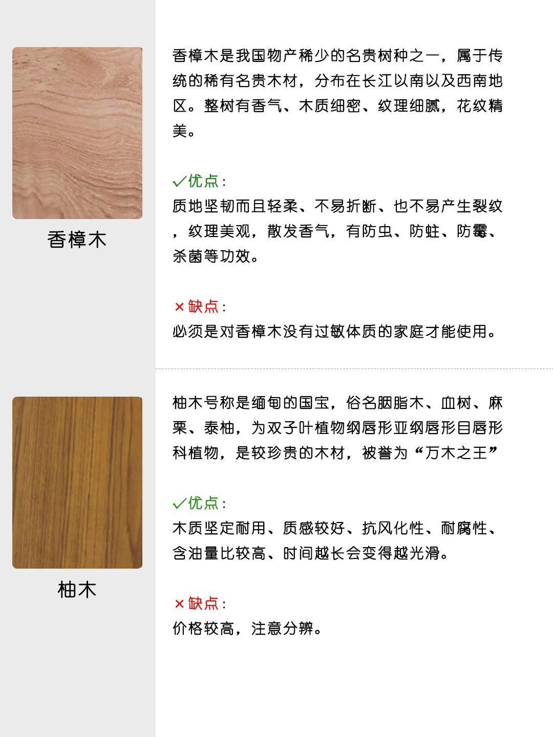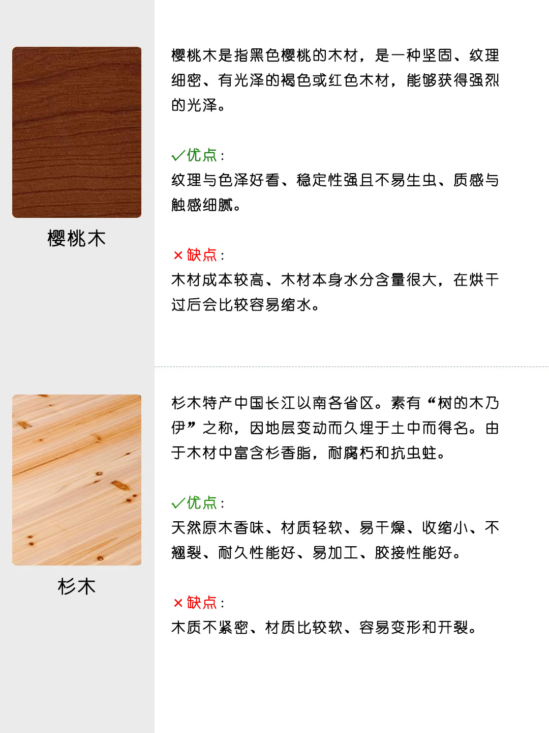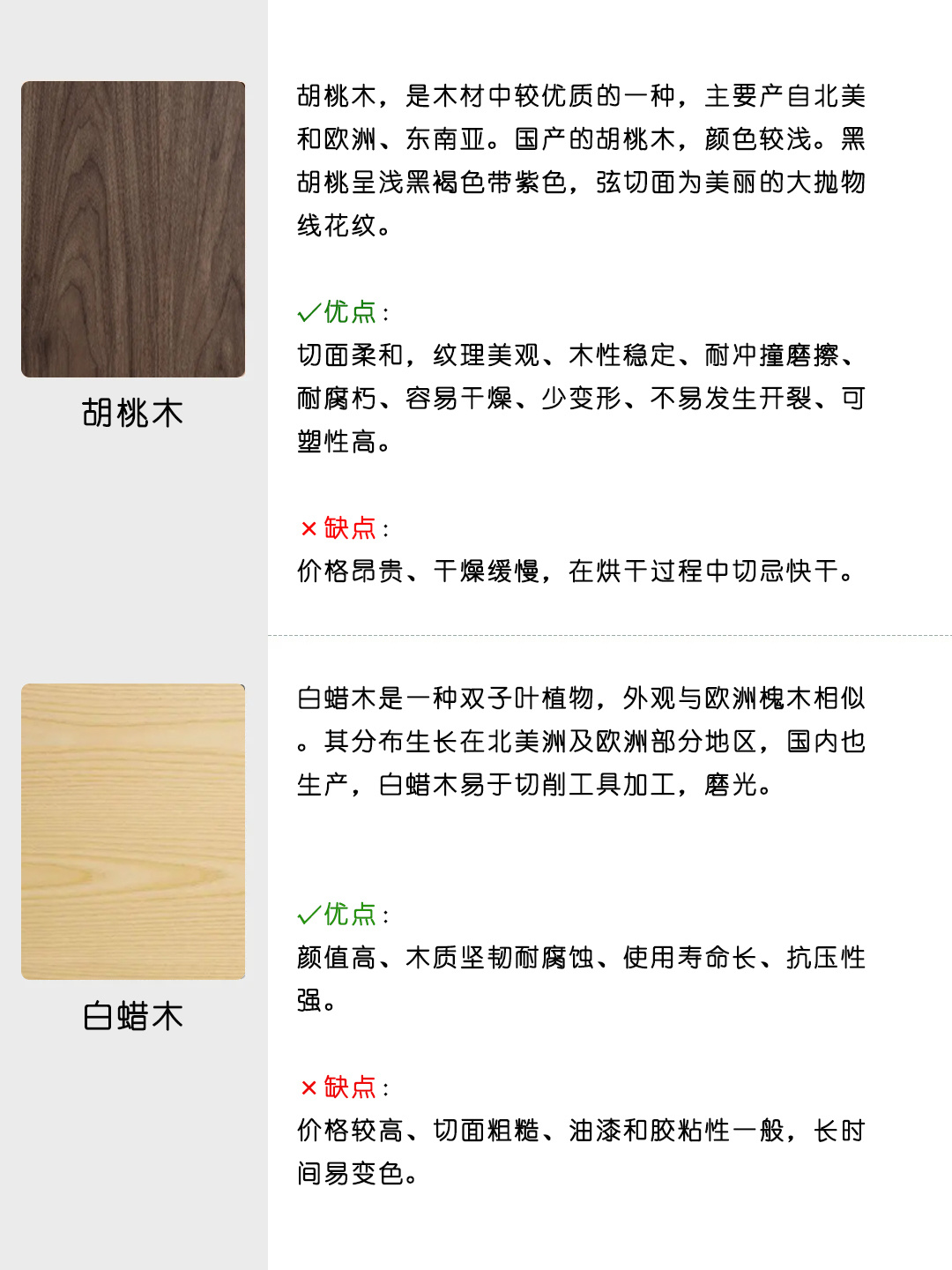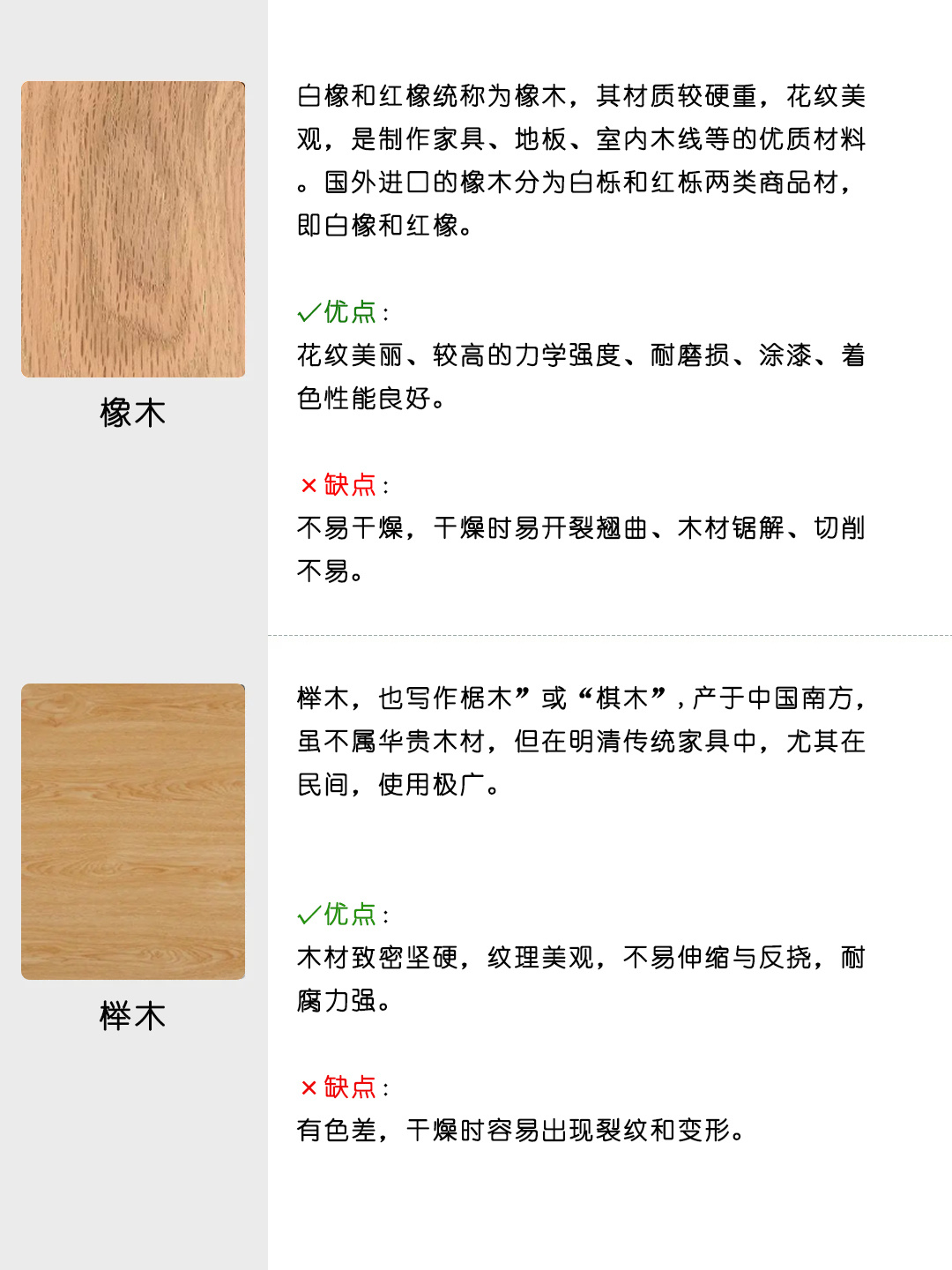 软装设计师必知❗❗常用的家具木材优缺点 选实木家具时,我们经常会根据家中的装修风格来选木质家具,然而木的种类繁多,选起来让人眼花缭乱。除了颜色、纹理外,还担心搭配不好,或稳定性不高。今天这篇常用的实木家具干货指南,从优缺点出发 ,助力你买到最适合自己的实木家具。