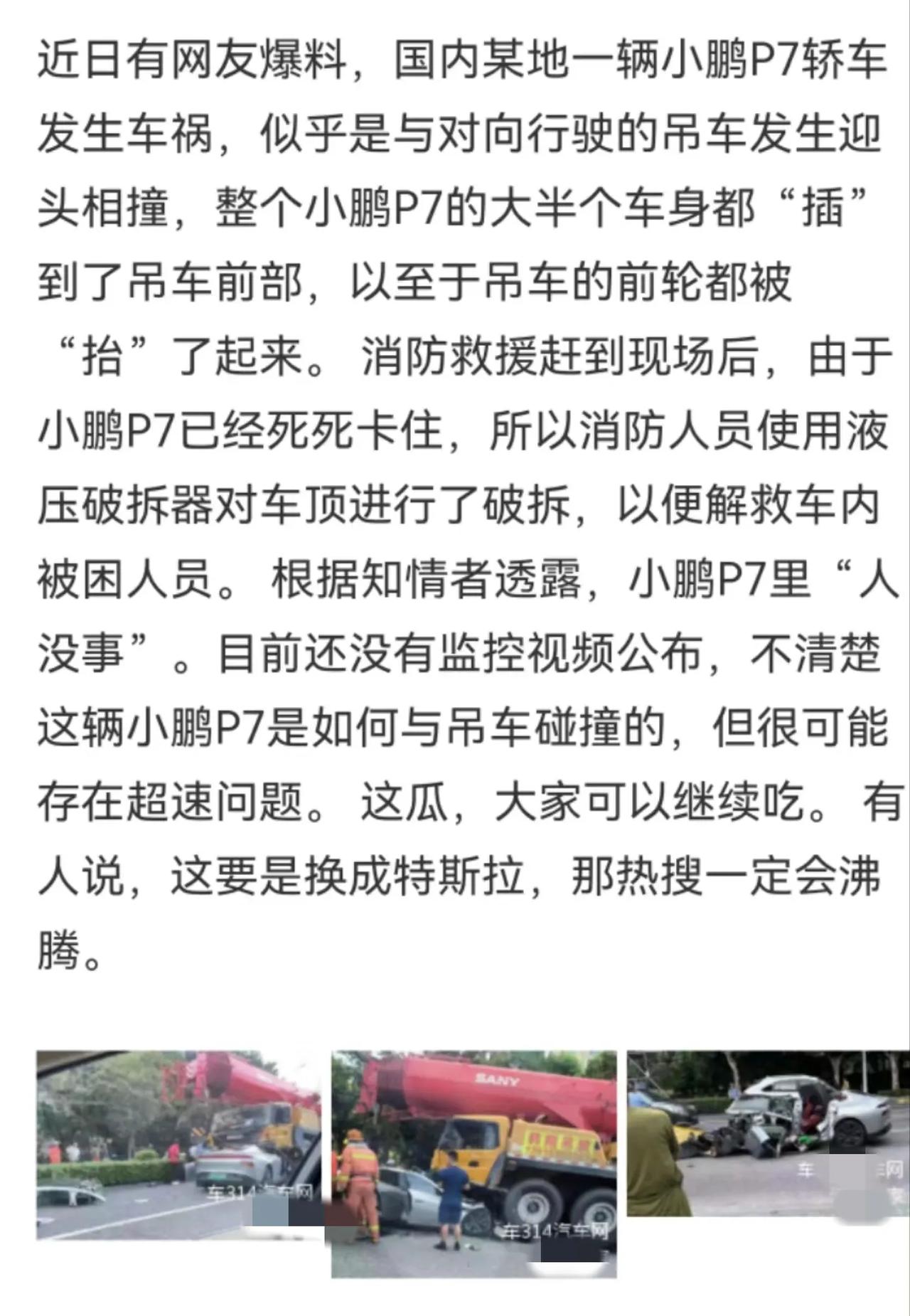 不要人云亦云,这要是特斯拉,立马刷爆全网上热点,所谓的什么ABC柱全断,车顶被削掉!拜托,这个明显是为了救援被消防破拆切割掉的车顶。 正面100%冲撞百吨多重型吊车,换做是任何车都难逃惨烈的现场,这个明显一看不是超速就是分心驾驶,甚至都不存在什么自动驾驶辅助驾驶出故障一说,不能盲目猜测和臆想。