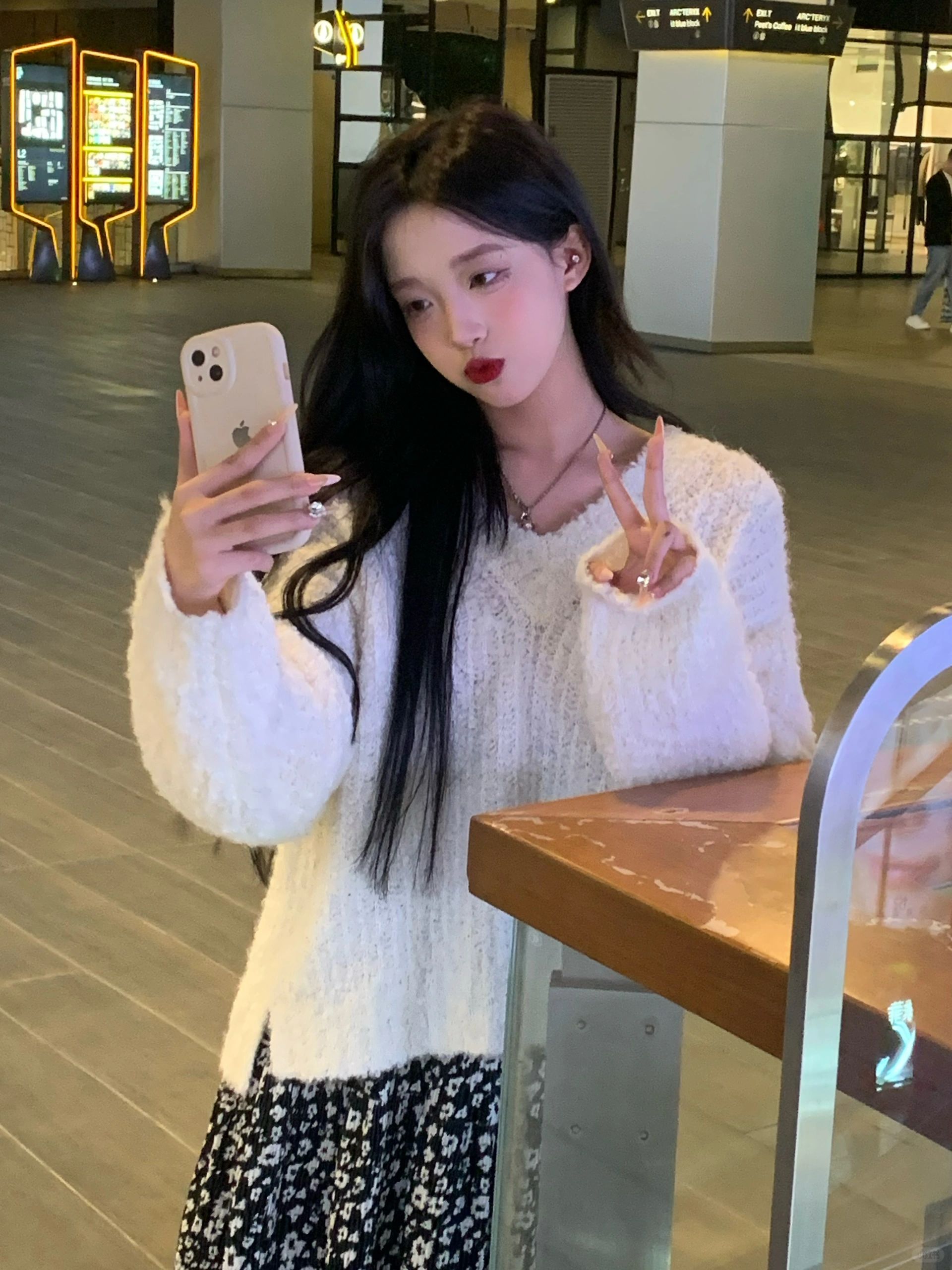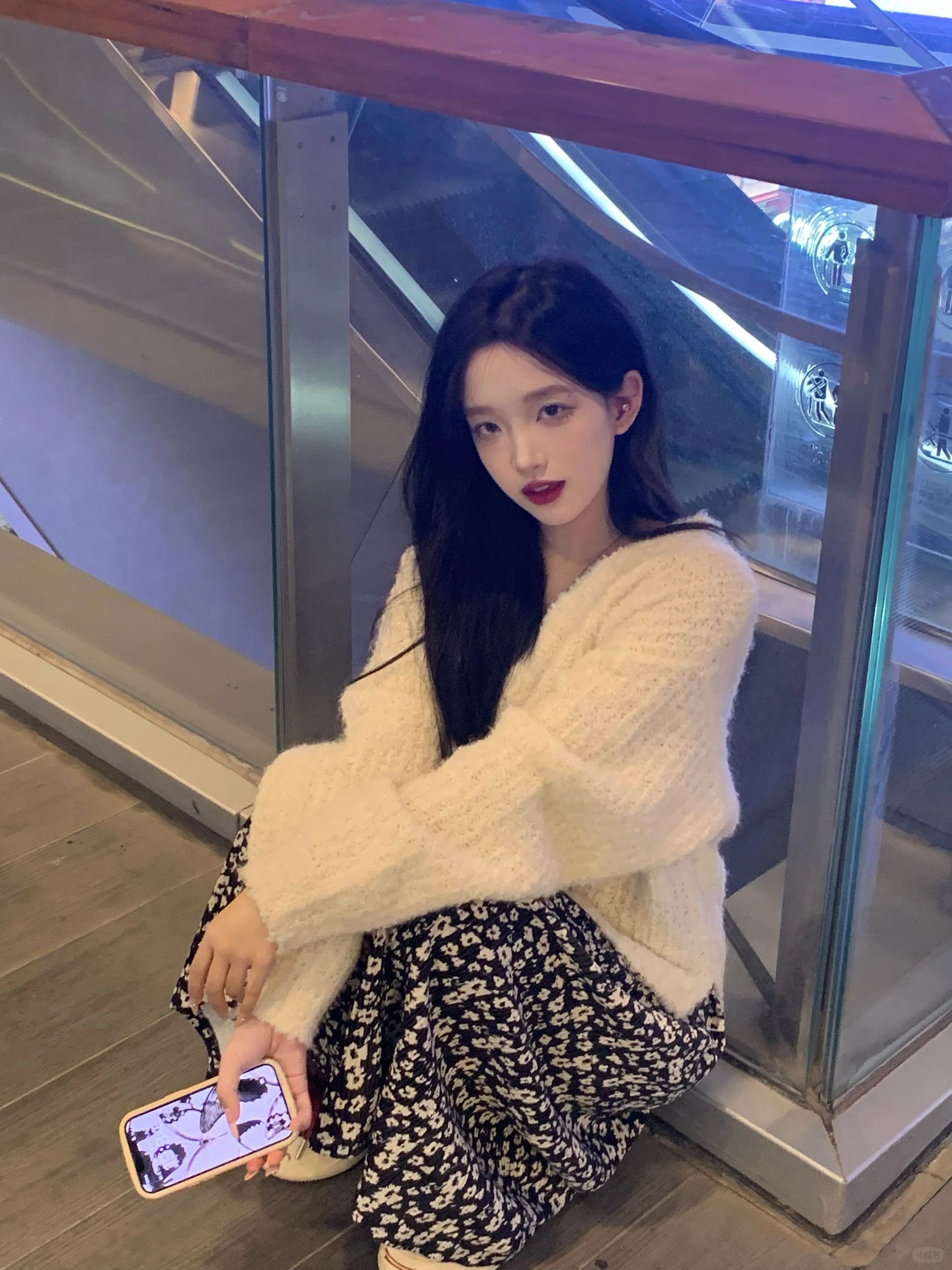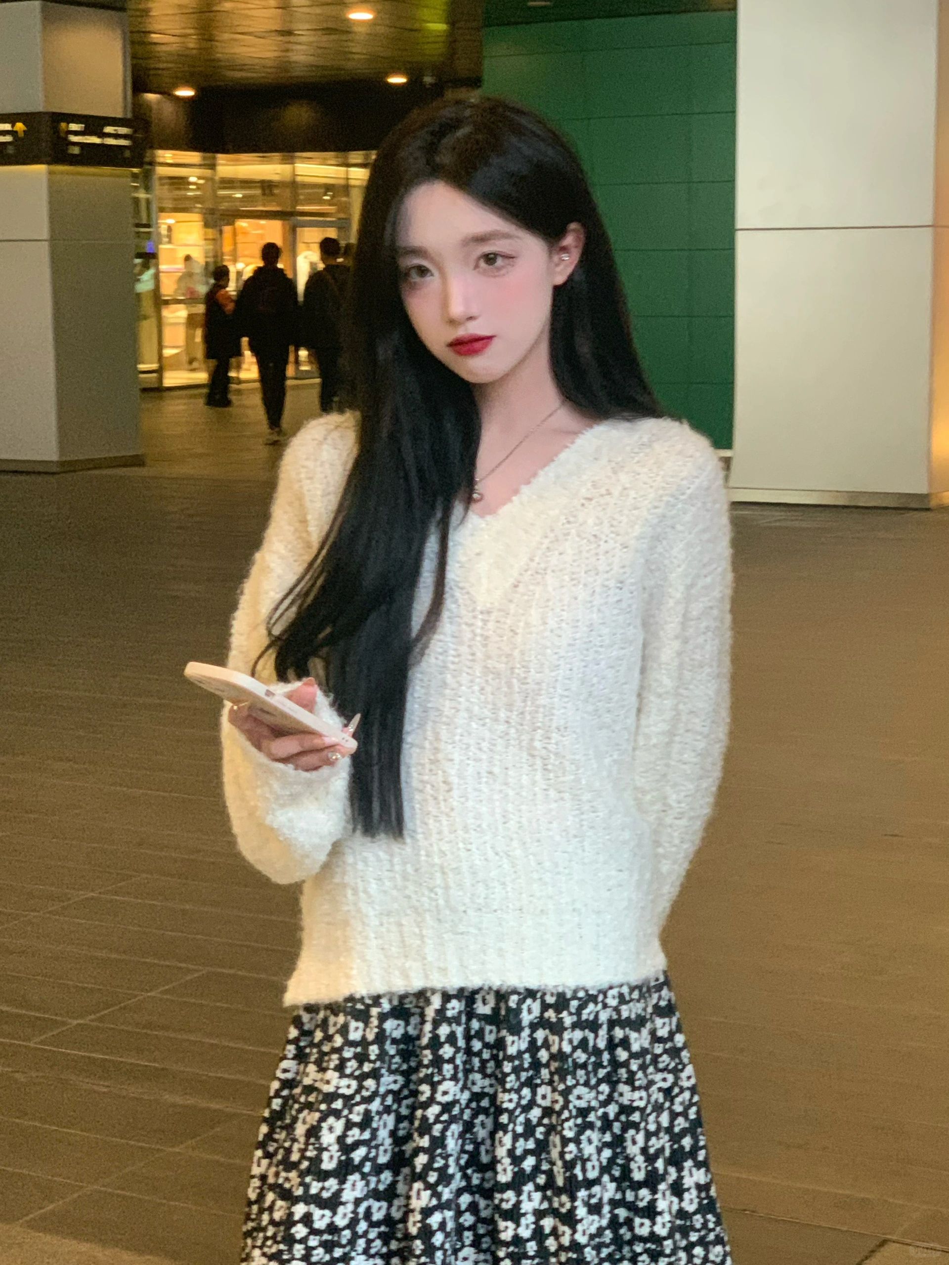 软糯的白色毛衣配小碎花长裙