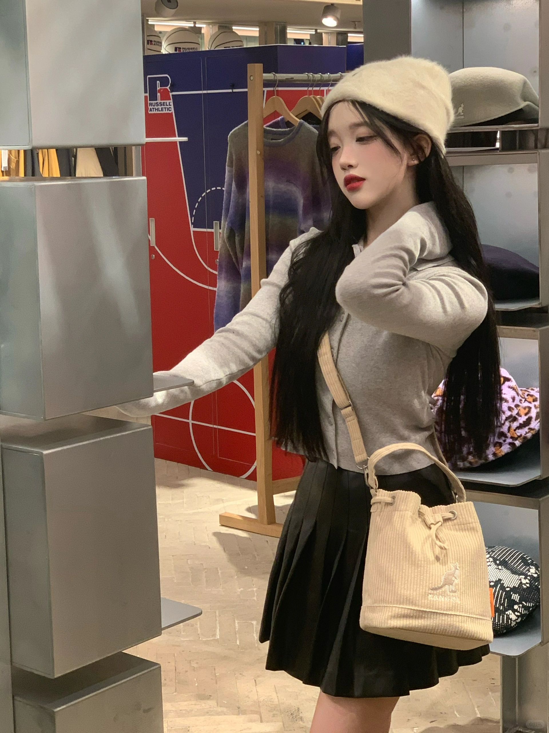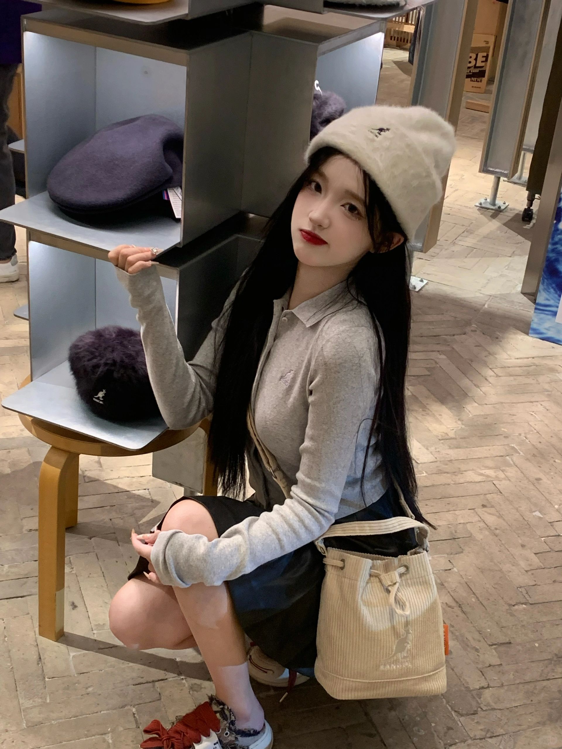 针织帽配灰色开衫加包包的搭配太日常啦