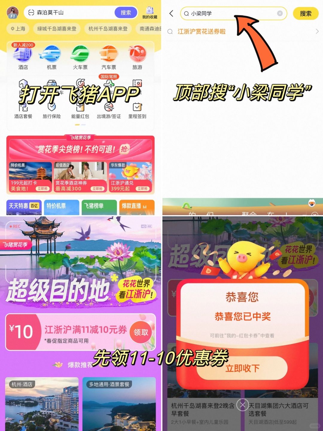 打开飞猪APP→🔍输入“小梁同学”→即可进入活动页→就能看到推荐的产品啦~~记得先领11-10r的优惠券再下单哦