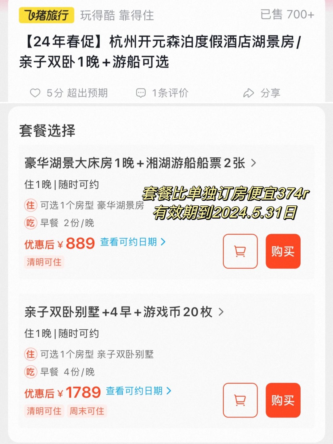 💰价格:889r,包含豪华湖景大床房1晚+湘湖游船船票2张,比单独订房便宜374r