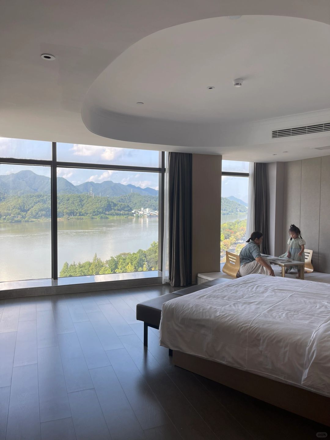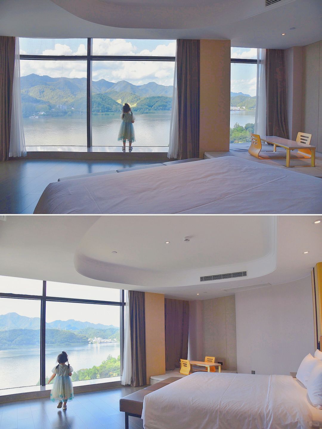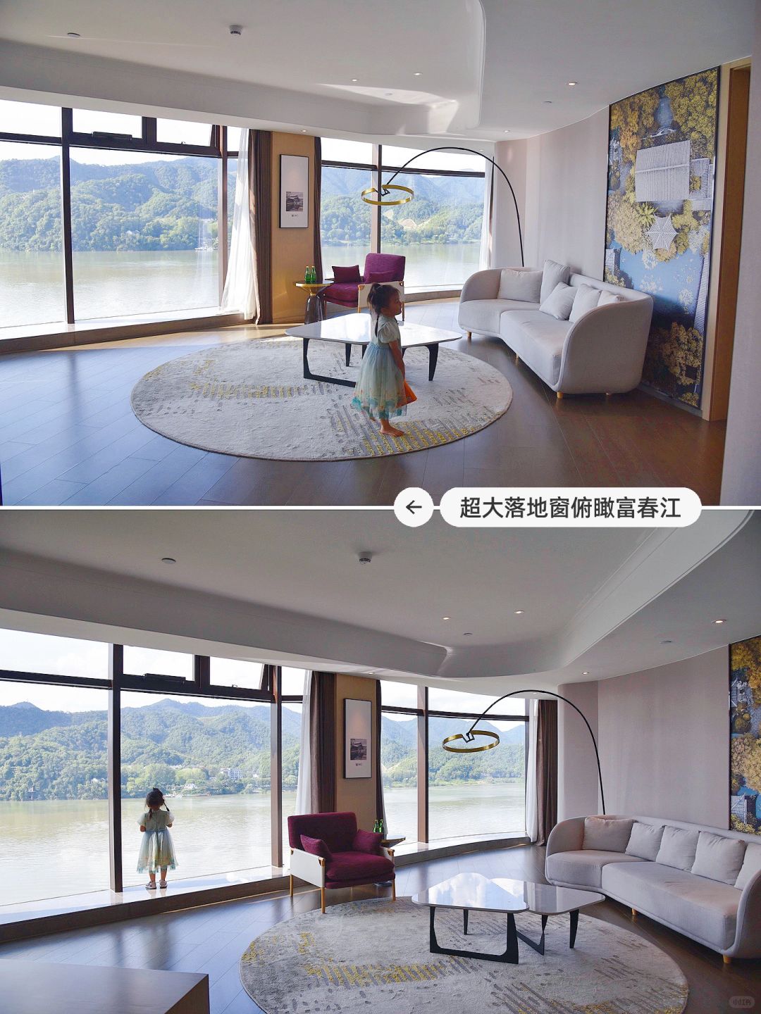 2️⃣酒店就在富春江边上,妥妥的一线江景房,打开房门那一刻,完全就不想出门啦!!我们定的几木享浴江景套房被升级到了豪华江景套房,这个房间有100多平,姑娘在里面撒欢的跑~
