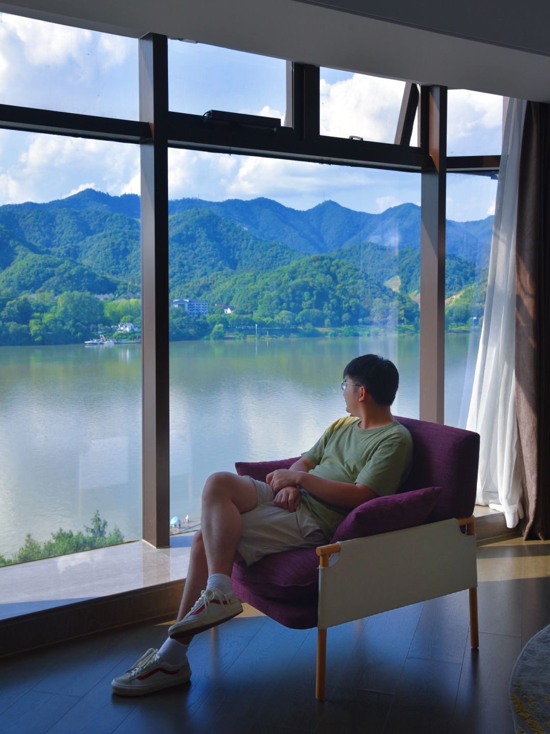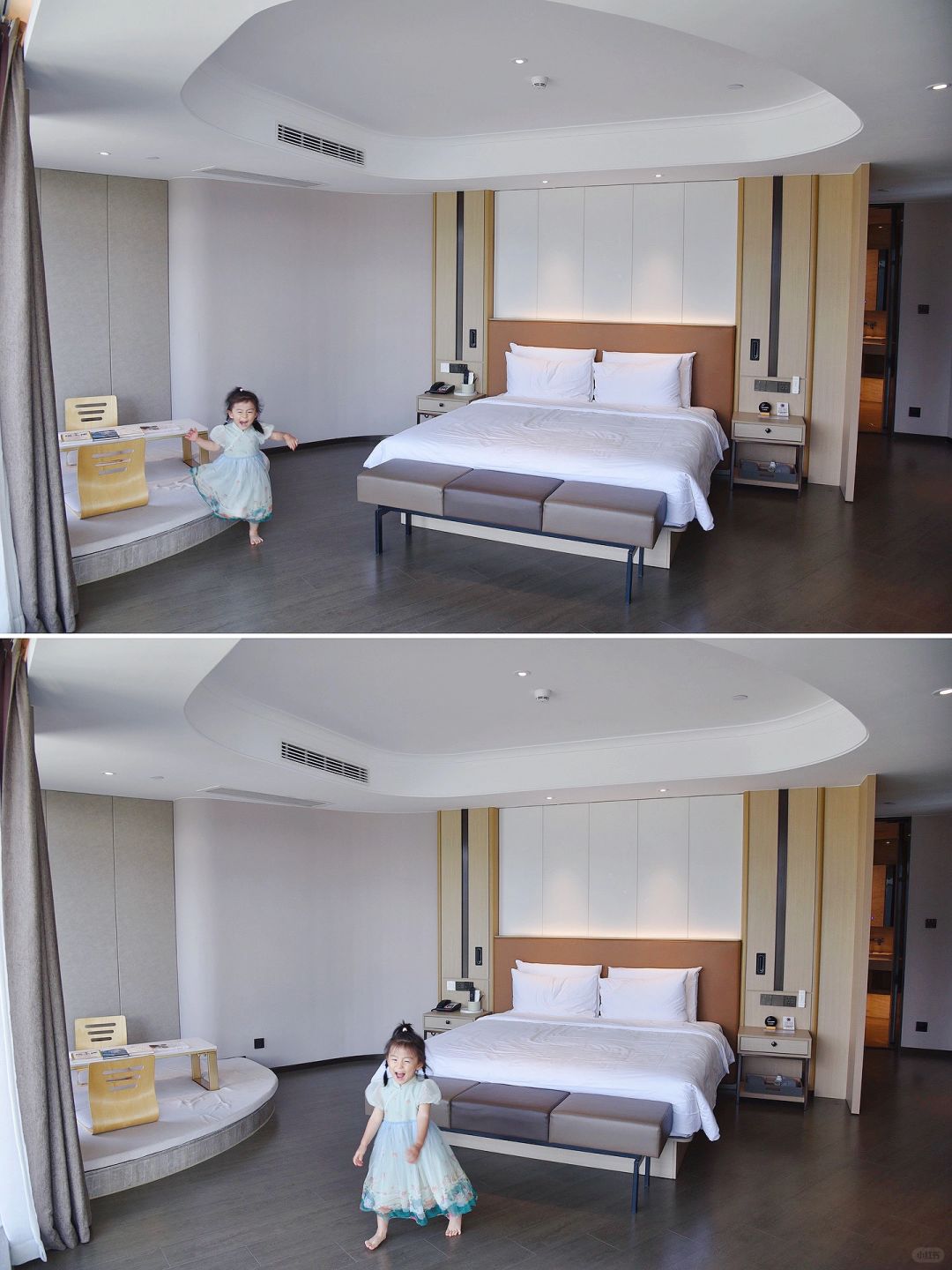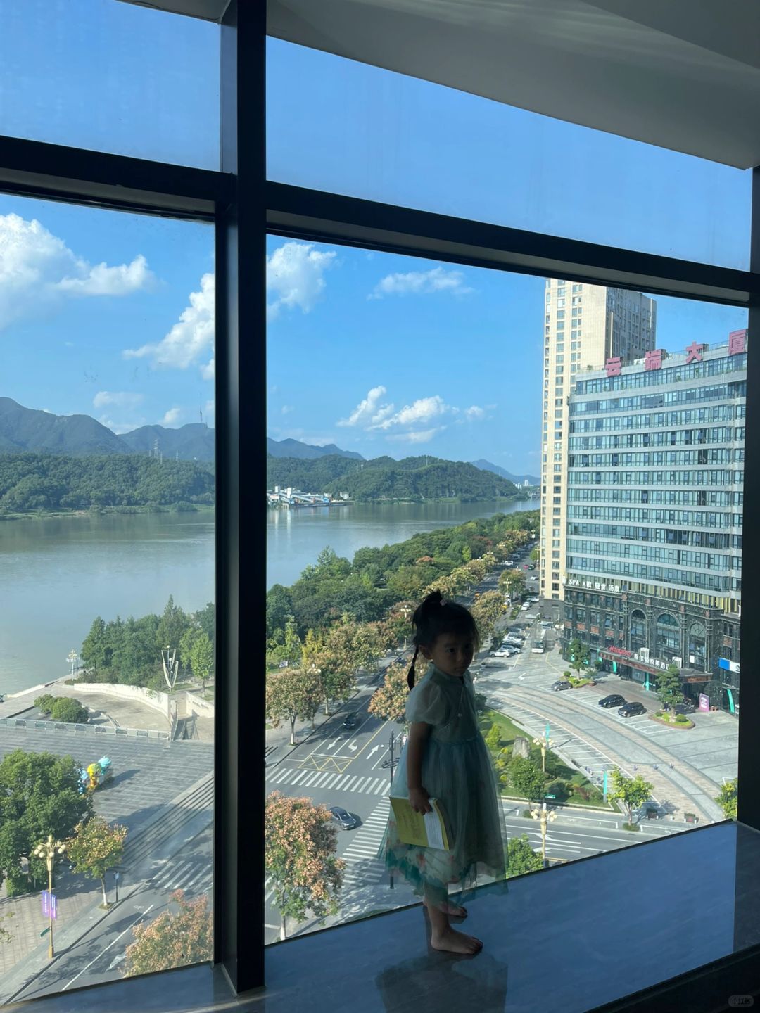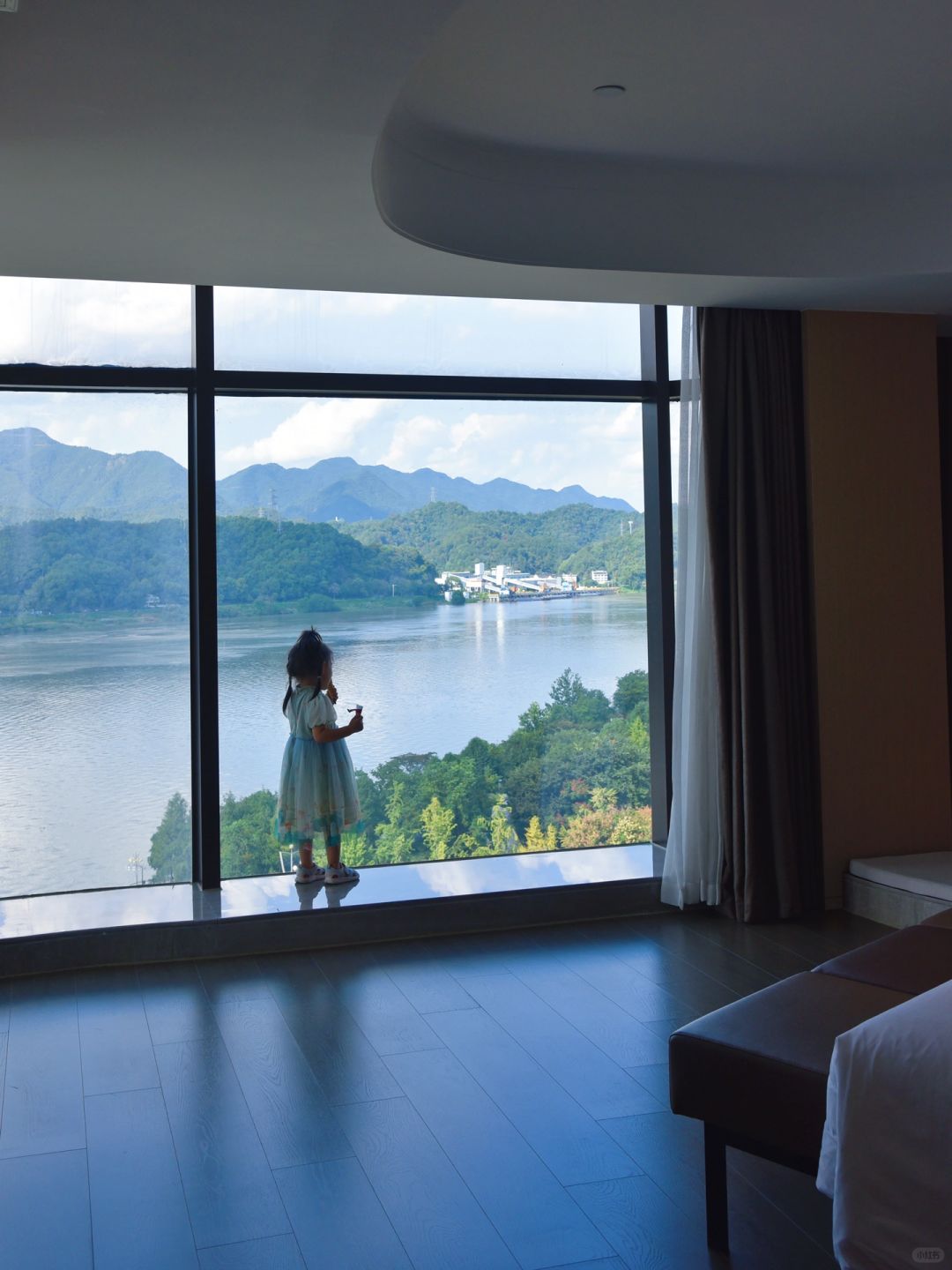 2️⃣酒店就在富春江边上,妥妥的一线江景房,打开房门那一刻,完全就不想出门啦!!我们定的几木享浴江景套房被升级到了豪华江景套房,这个房间有100多平,姑娘在里面撒欢的跑~