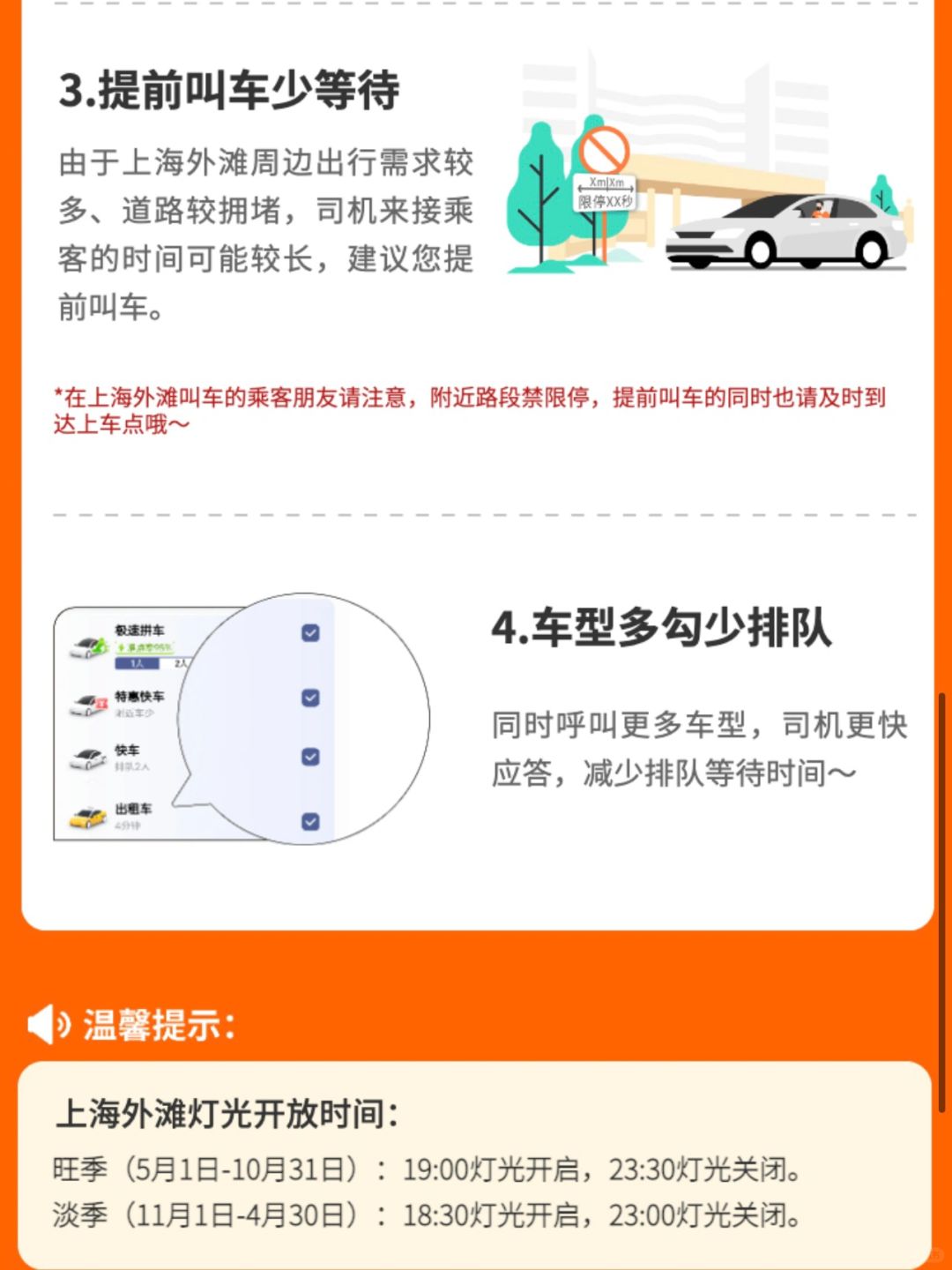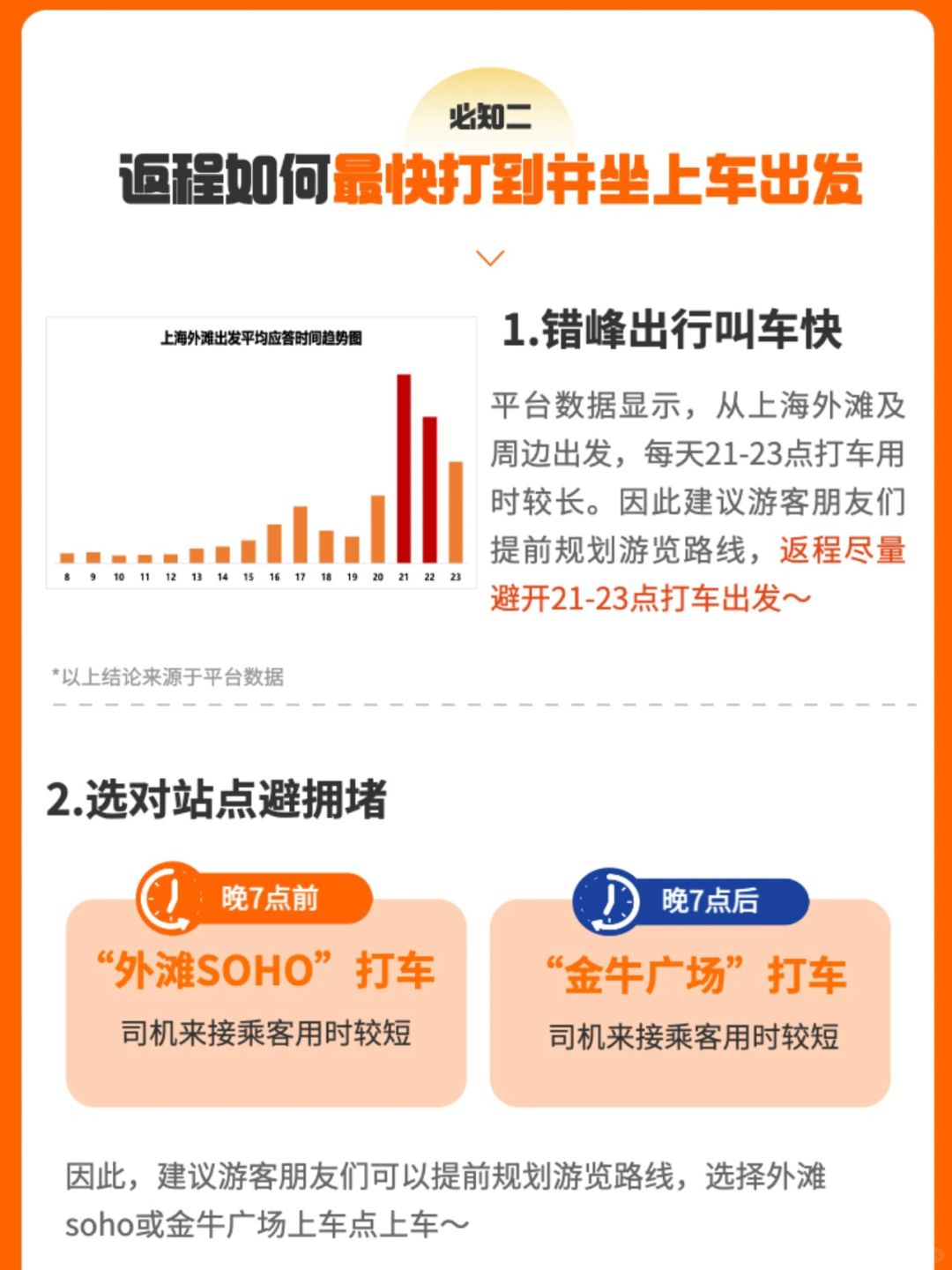 滴滴数据显示,从外滩及周边出发,每天21-23点打车用时较长。因此建议大家可以提前规划游览路线,返程尽量避开21-23点打车出发~~咱们可以18-20点看夜景,看完就可以撤啦~~