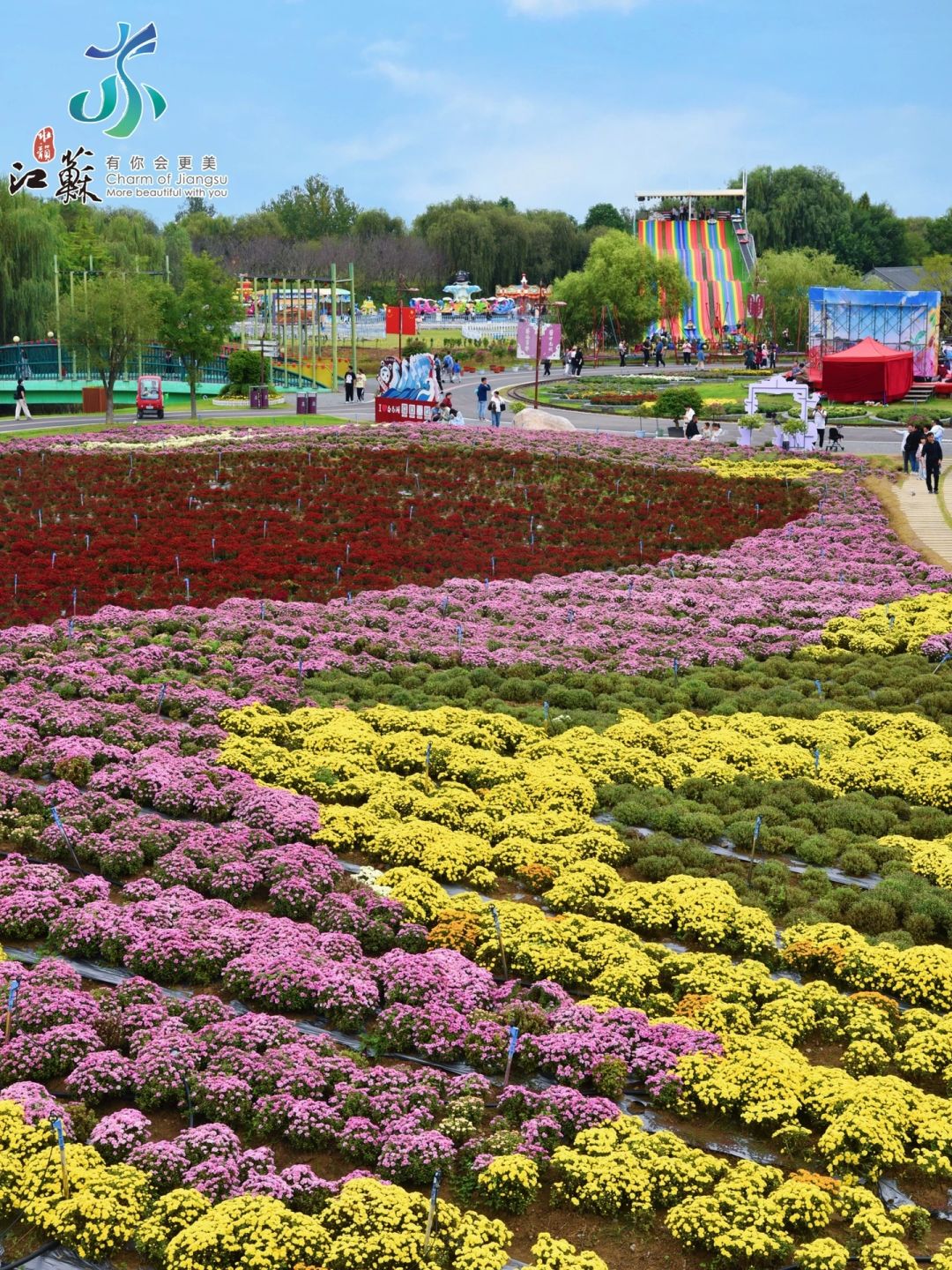 各种品种的菊花争相开放,还有彩虹滑道、小火车,很适合溜娃