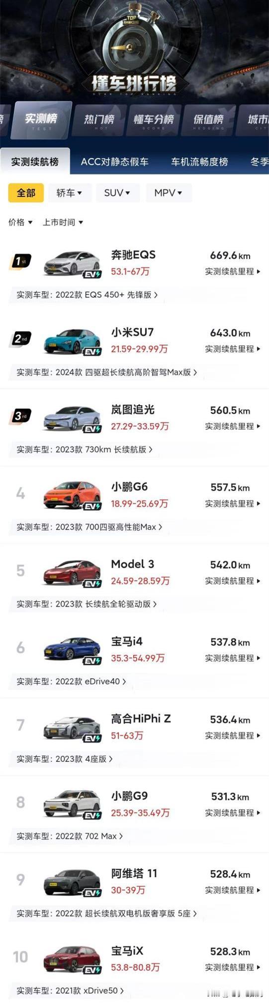 最后在实测续航榜上,小米SU7居然仅次于奔驰EQS,在售价只有对方一半的情况下,可以说是太过于优秀了一点吧。