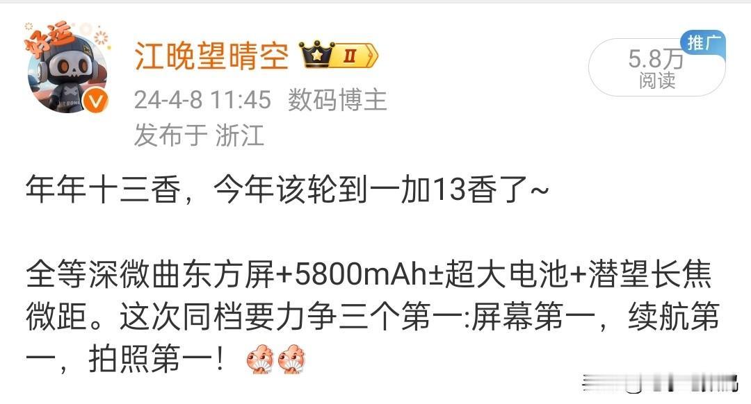 看来可以好好期待下一加13了~ 全等深微曲东方屏+5800mAh±超大电池+潜望长焦微距,妥妥又是一款全能型选手。 并且吐槽已久的外观也做了调整,还新增了IP68 等级! 力争拿下屏幕、续航、拍照,三个同档第一。