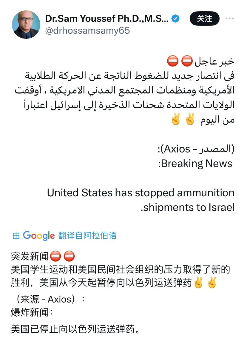 突发新闻:拜登政府暂停了一批运往以色列的弹药。这是自去年10月7日以来美国首次暂停向以色列国防军运送此类武器。 有观点认为,这是美国国内学生运动对拜登政府施压所致。
