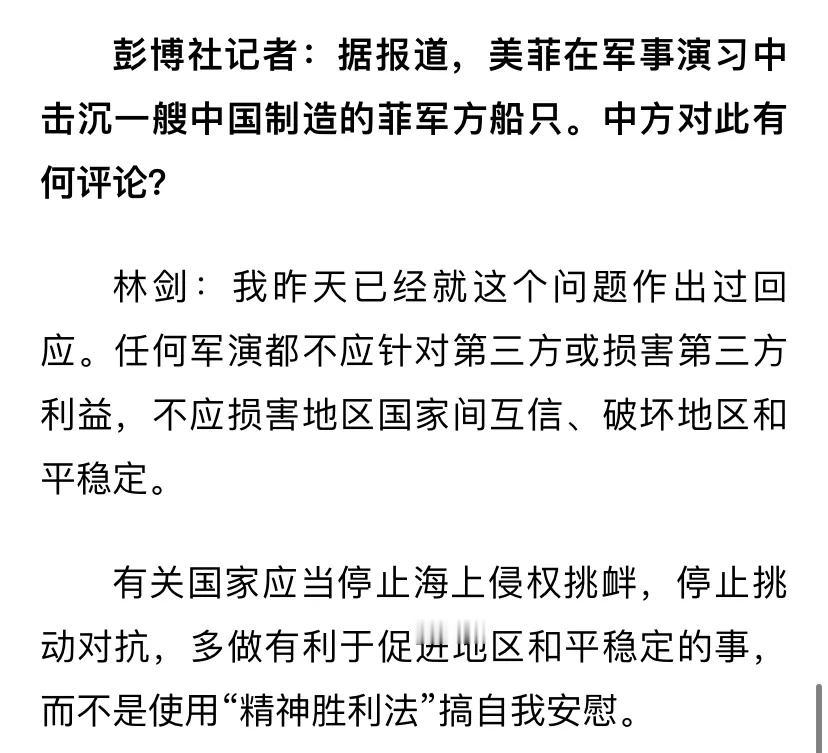 外交部回应美菲军演击沉中国制造的船只,外交部发言人:精神胜利法