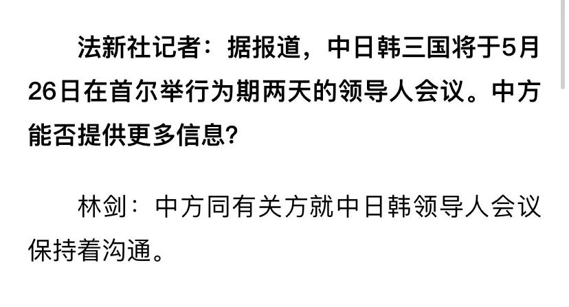 法新社记者:据报道,中日韩三国将于5月26日在首尔举行为期两天的领导人会议。中方能否提供更多信息?