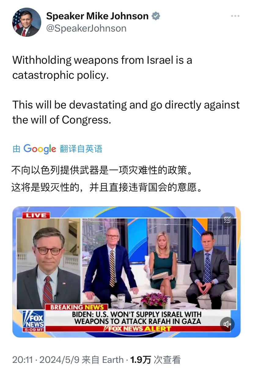 美国国会众议长迈克·约翰逊刚刚(北京时间5月9日20:11)写道:“不向以色列提供武器是一项灾难性的政策。这将是毁灭性的,并且直接违背国会的意愿。”